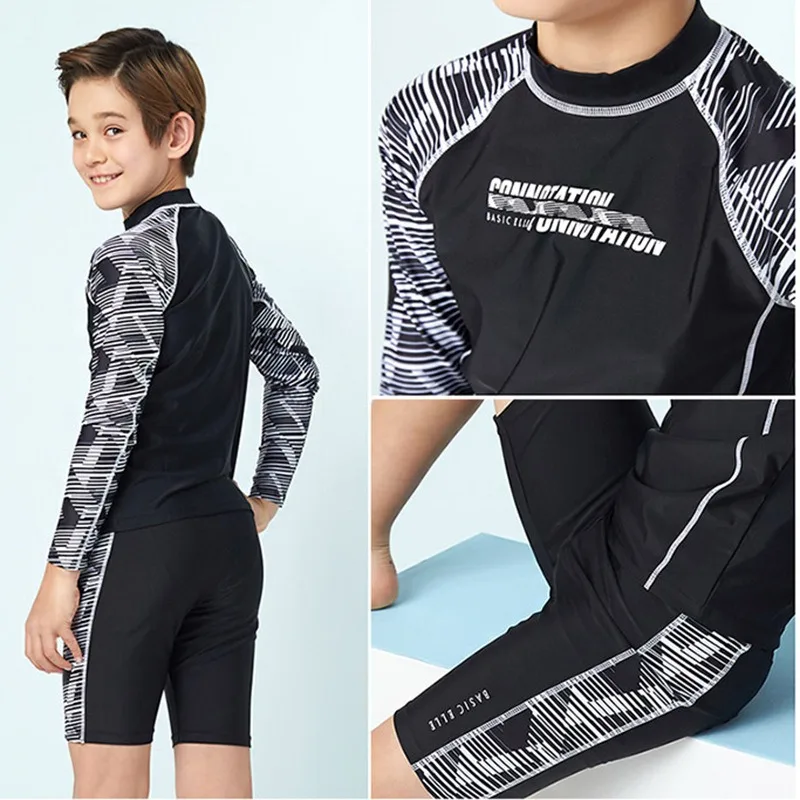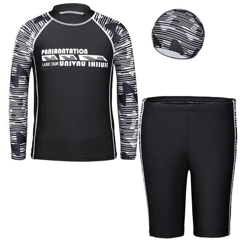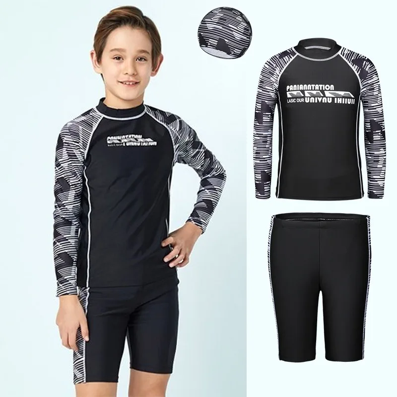 소년을위한 3 피스 스플릿 수영복 십대 수영복 어린이 수영 트렁크 및 모자 긴 소매 태양 보호 어린이 수영복