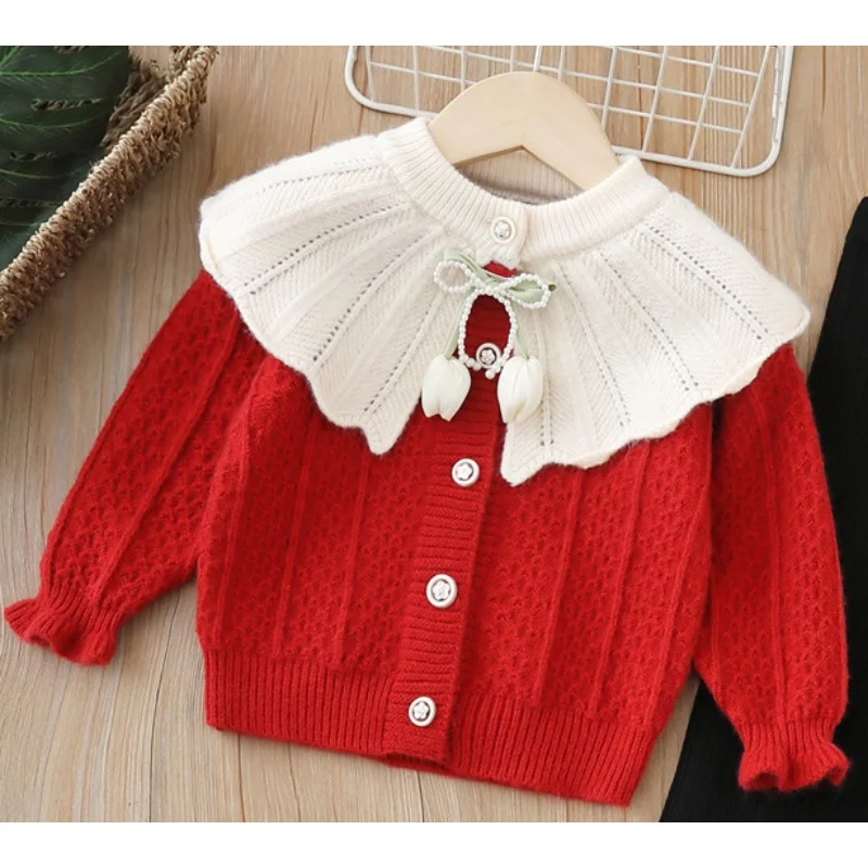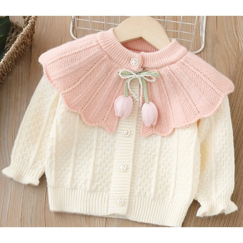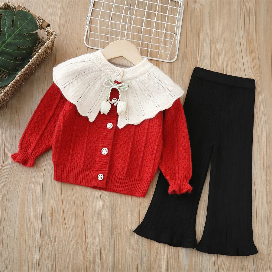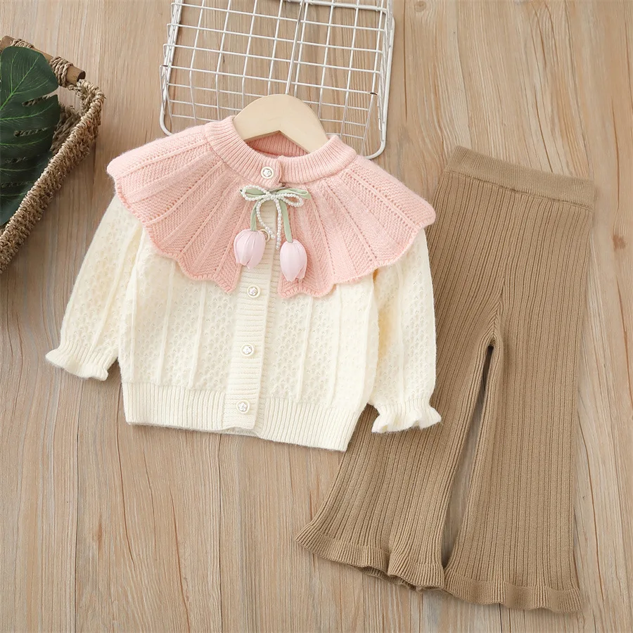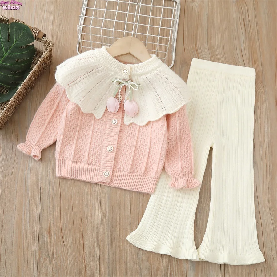 아동 여아 니트 세트 2-6세 여아 의류 인형 칼라 튤립 포인트 가디건 & 플레어 팬츠 귀여운 캐주얼 가디건 여아