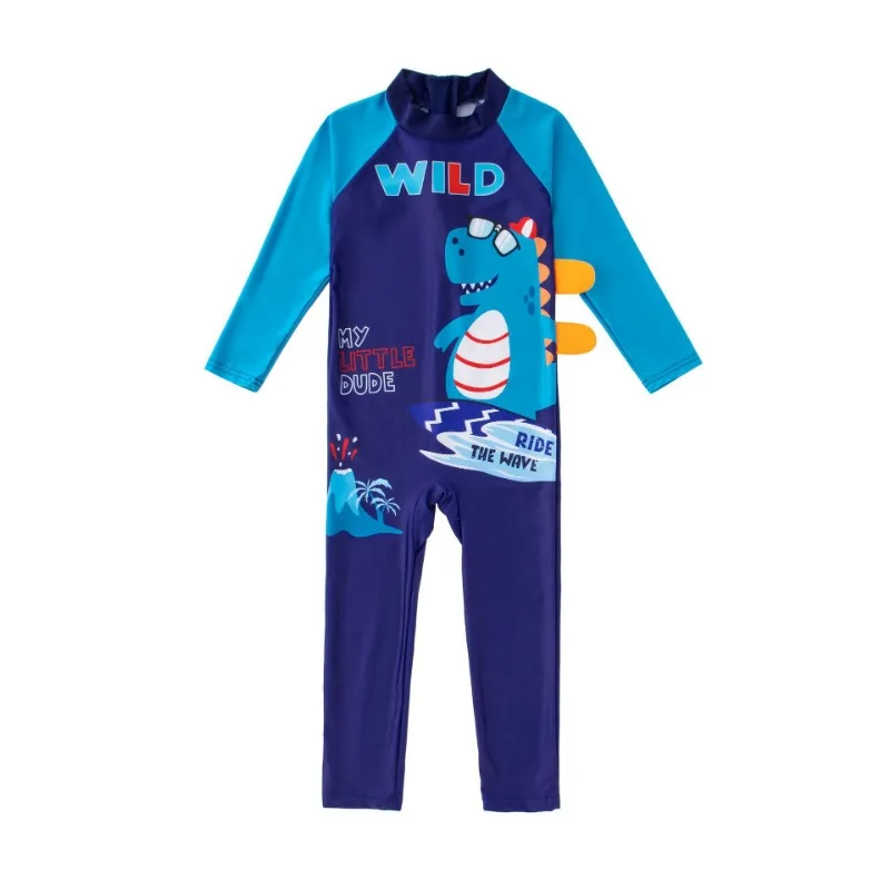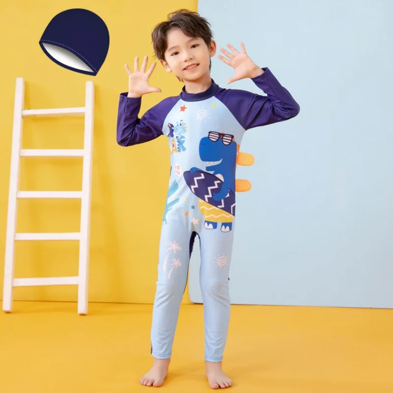 아이들을위한 귀여운 긴 소매 수영복 소년 수영복 비치 선 스크린 만화 수영복 수영 모자 어린이 서핑 슈트