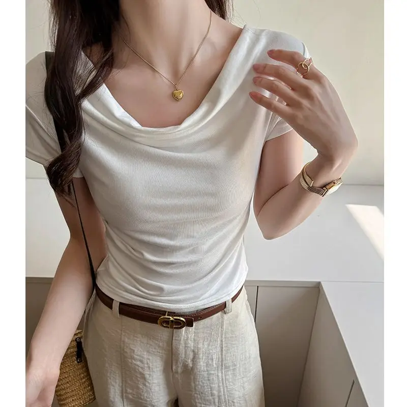 여름 짧은 소매 티셔츠 여성 사이드 플리츠 슬림 피트 오프 숄더 넥 크롭 탑