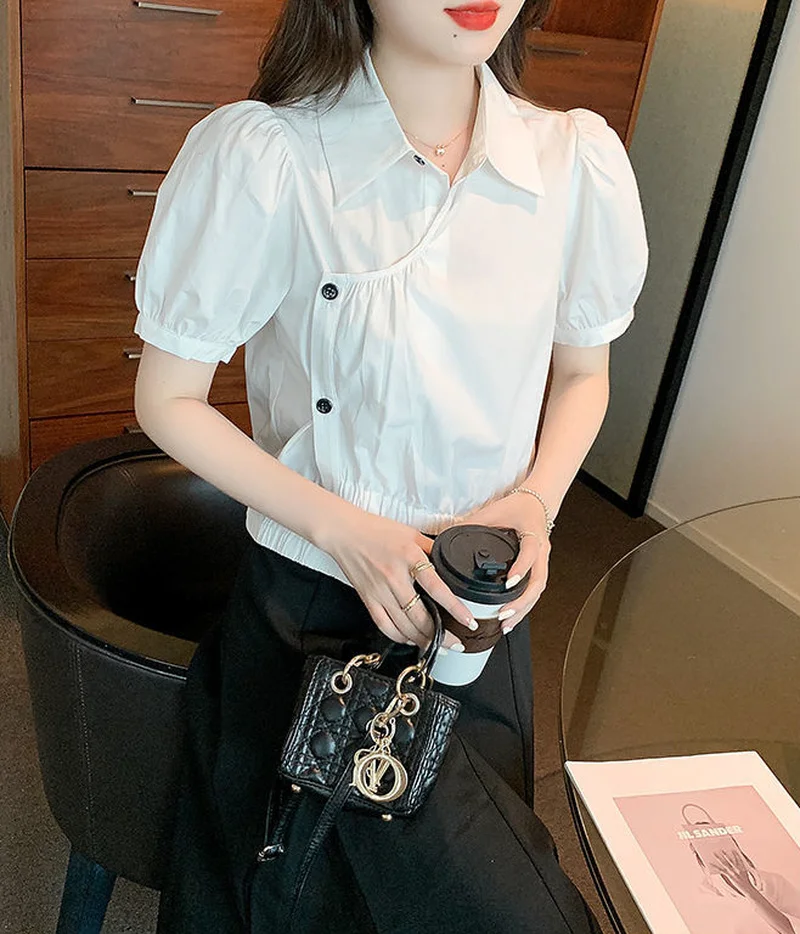 여성용 귀여운 셔츠 및 블라우스 상의, 푹신한 소매 칼라, 단추 업 화이트 노벨티, 2024 여름 신기한 옷