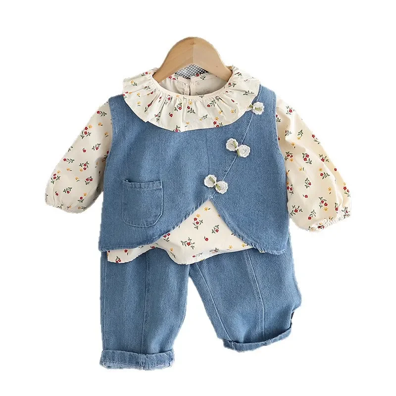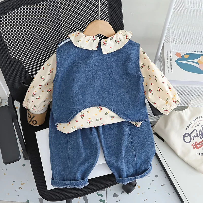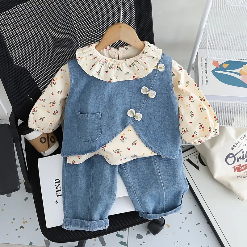 여아용 면 소재 정장 3종 세트 (1-5세) 데님 조끼, 꽃무늬 탑, 와이드 레그 청바지, 귀엽고 캐주얼한 여아 의류