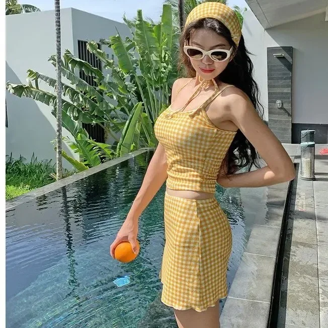2025 신상 3피스 수영복 슬리밍 커버업 휴가용 뷰티 체크 무늬 보수적인 한국 스타일 비키니 세트