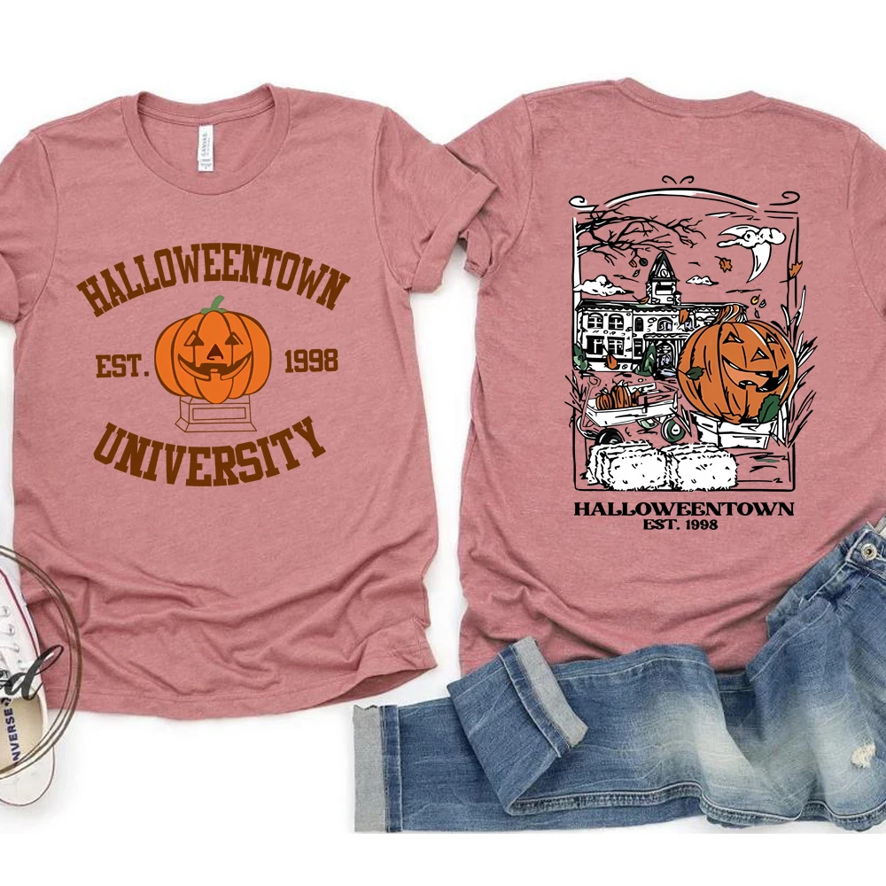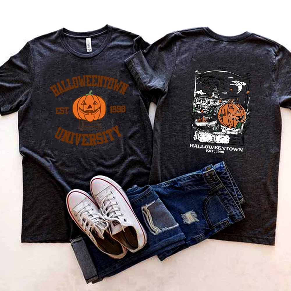 빈티지 Halloweentown 1998 티셔츠 2 사이드 프린트 Halloweentown 대학 셔츠 호박 가을 티셔츠 레트로 할로윈 파티 Tshirt