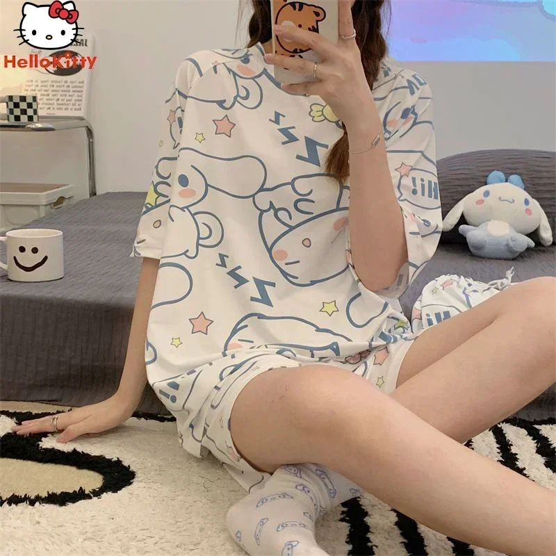 Kawaii Sanrio Anime Cinnamoroll Kuromi 잠옷 여름 단순 패션 섬세한 귀여운 캐주얼 루즈 편안한 부드러운 여성용 세트 선물