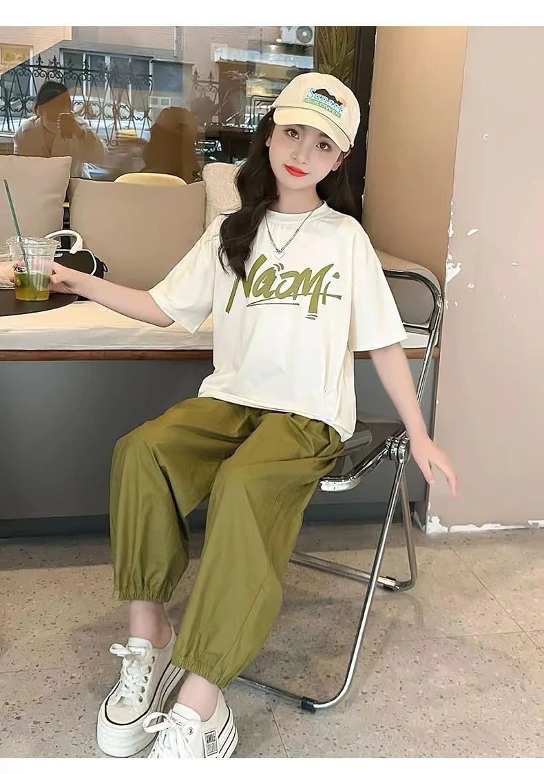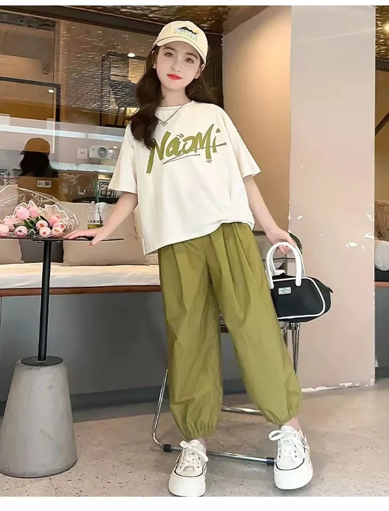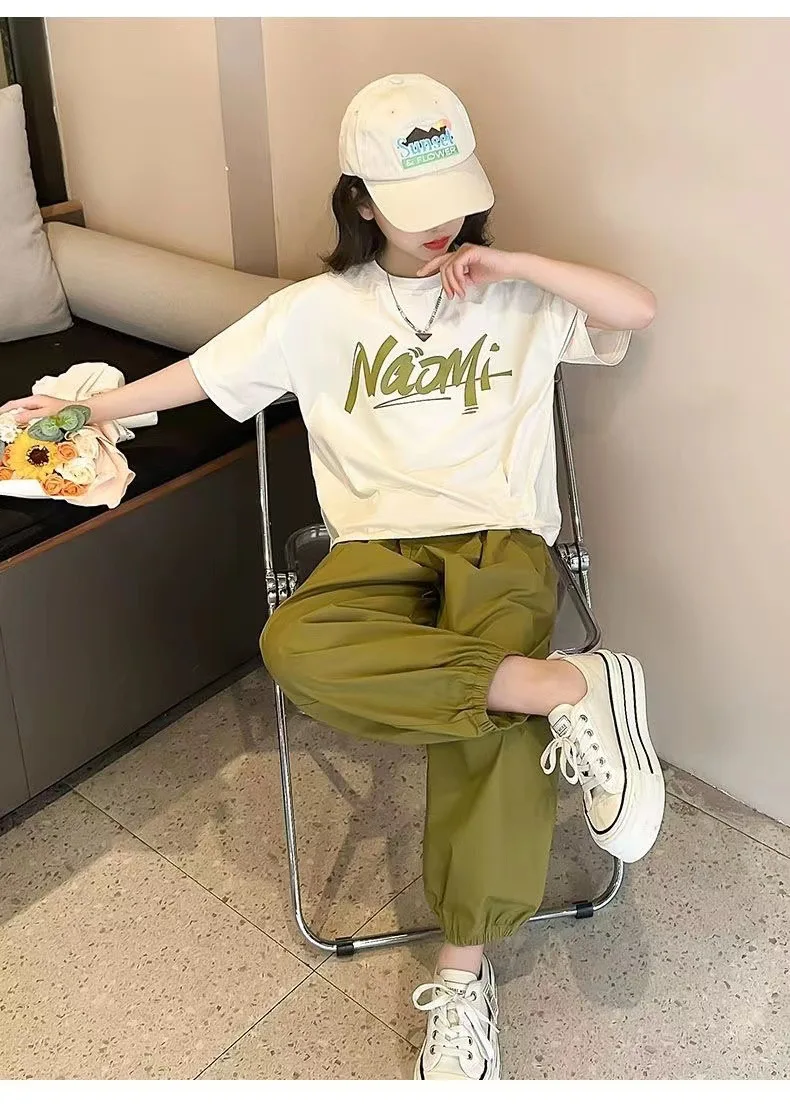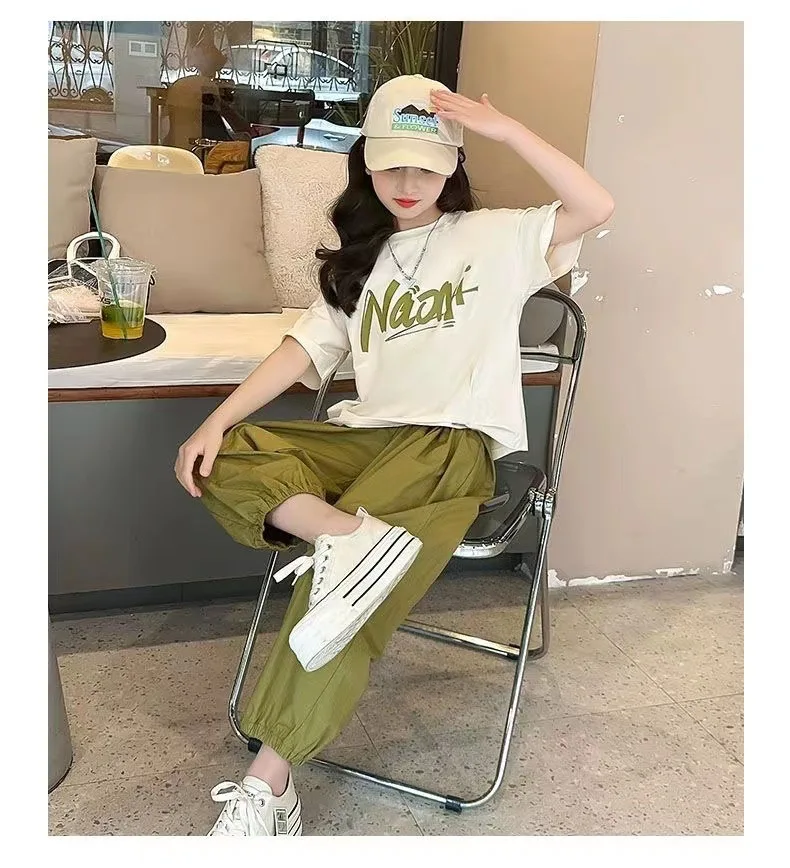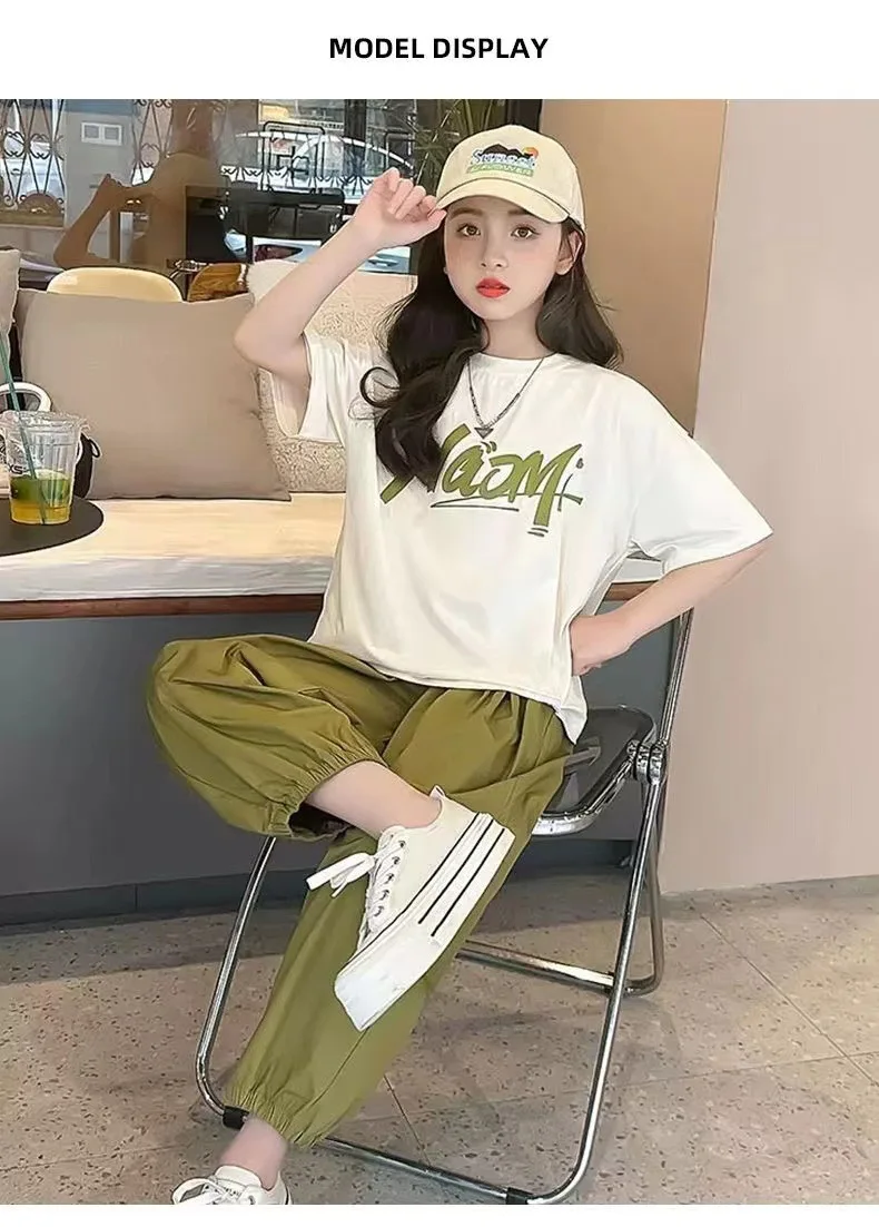 2025년 여름 아동복 여아 트레이닝복 레터 티셔츠 + 그린 스포츠 발목 묶음 바지 키즈/청소년 5 6 7 8 9 10 11 12세