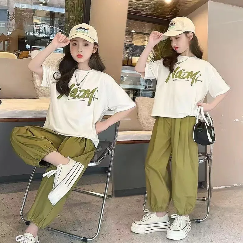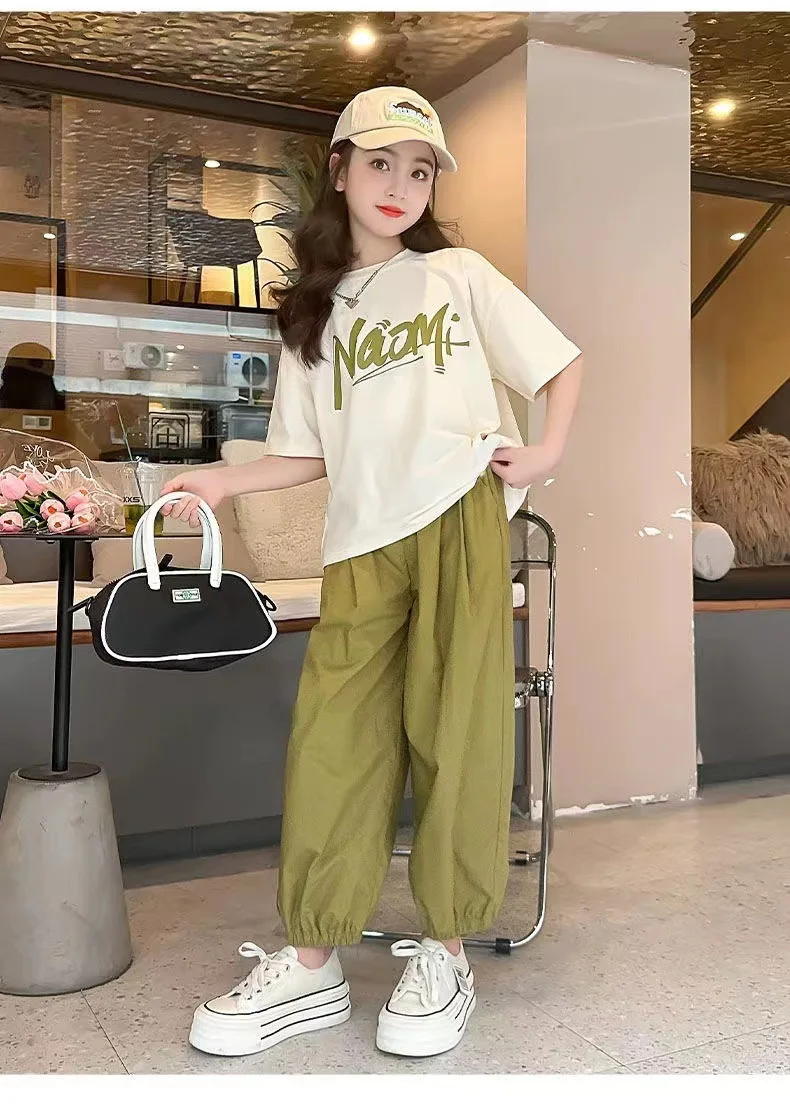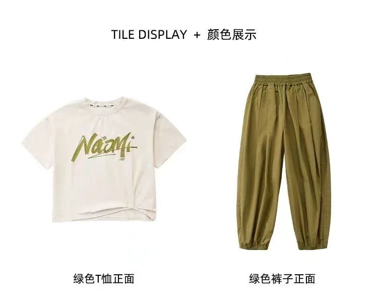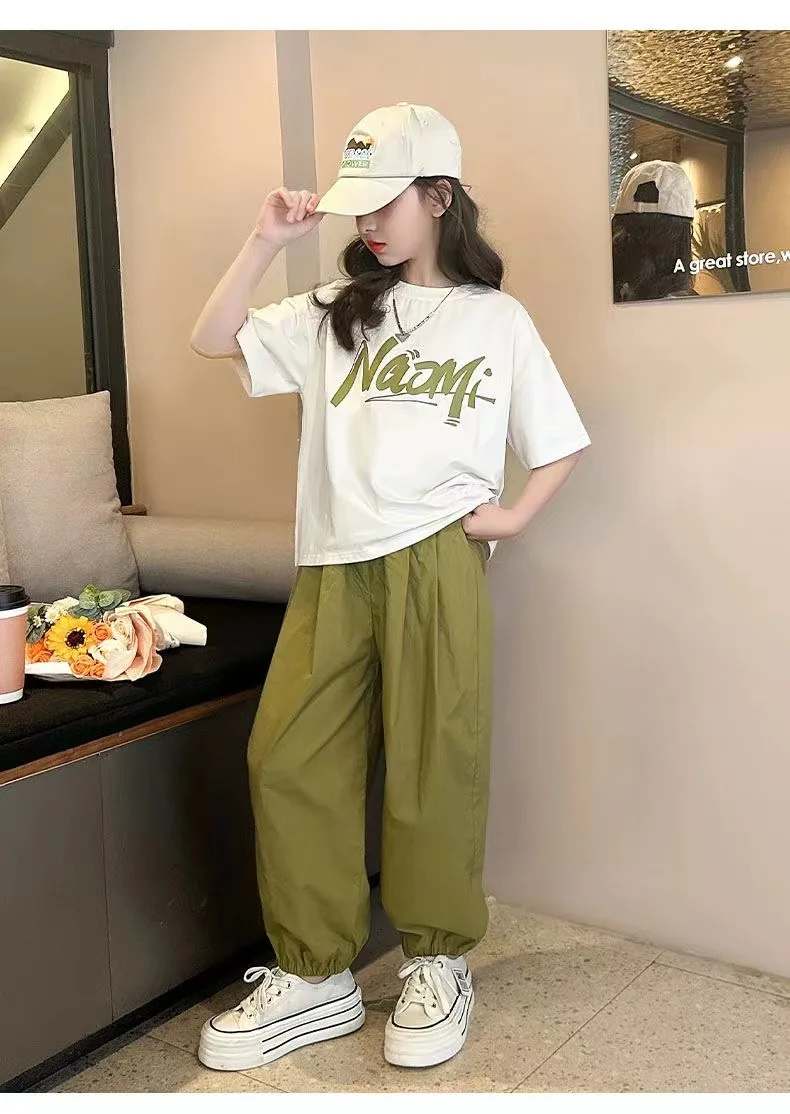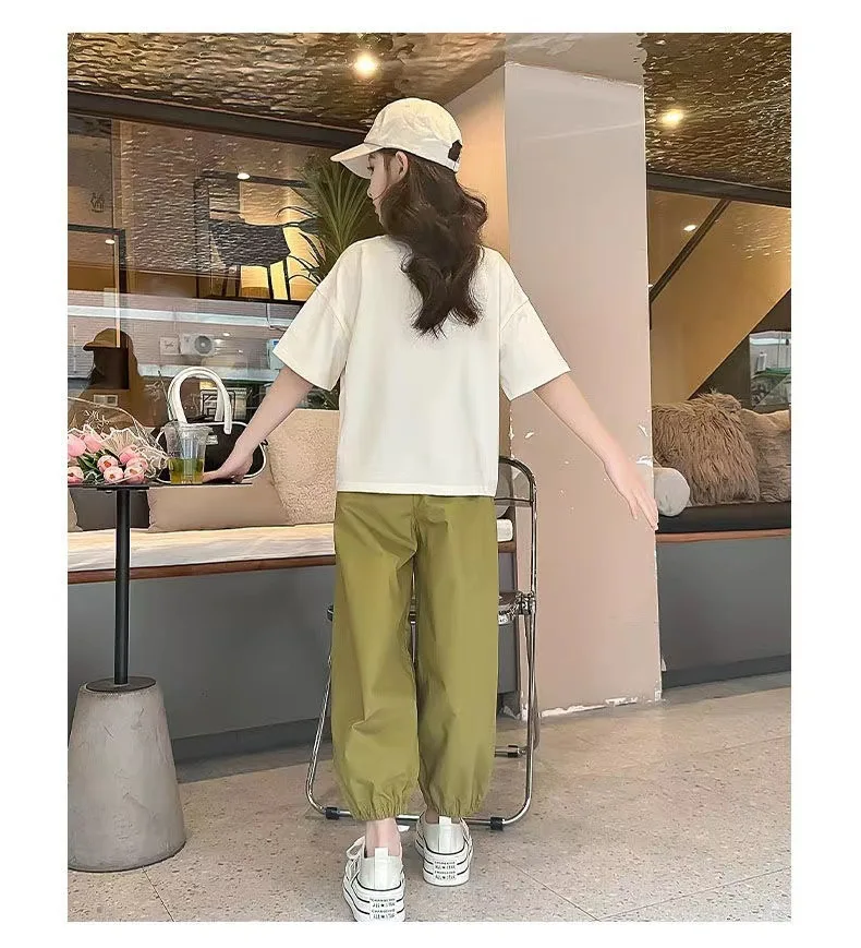 2025년 여름 아동복 여아 트레이닝복 레터 티셔츠 + 그린 스포츠 발목 묶음 바지 키즈/청소년 5 6 7 8 9 10 11 12세