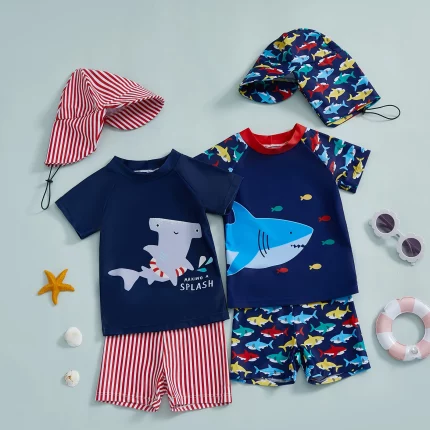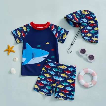 여름 수영복 비키니 세트, 귀여운 상어 프린트, 반팔 래시가드, 수영 상의, 반바지, 태양 모자, 비치웨어, 아기 소년 세트, 3 개