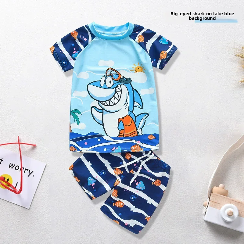 공장 직송 소년 수영복, 여름 반팔, 만화 2024, 어린이 2 피스 세트 수영 모자, 수영 브리프