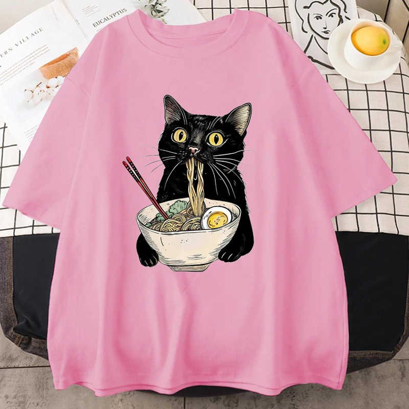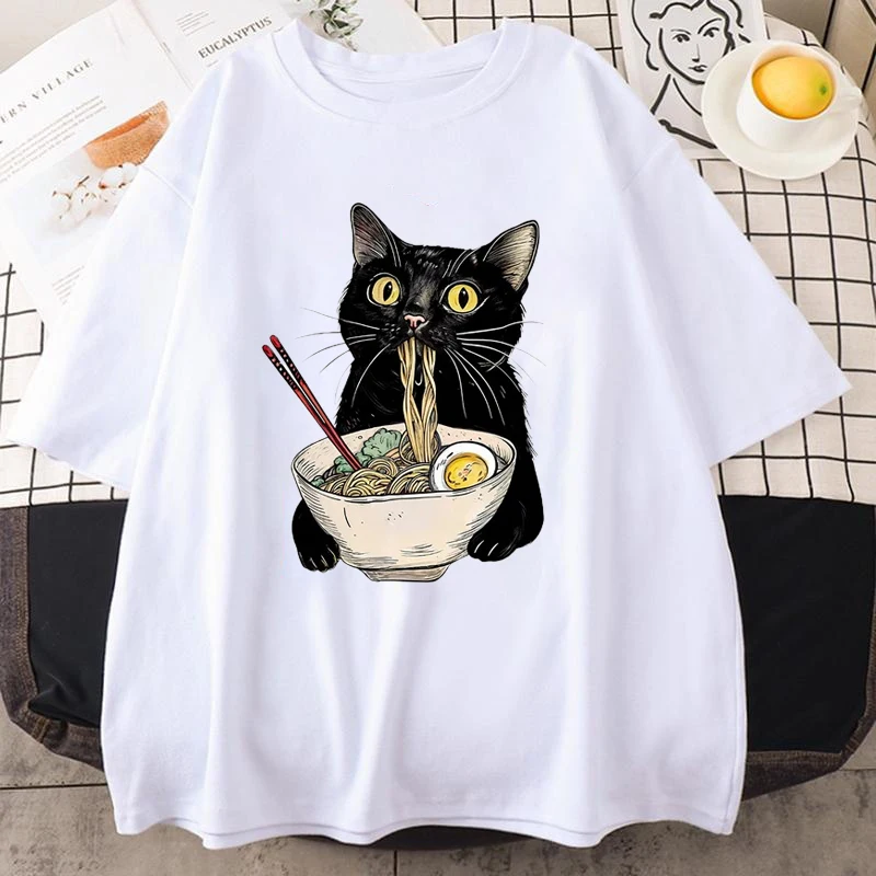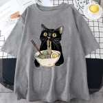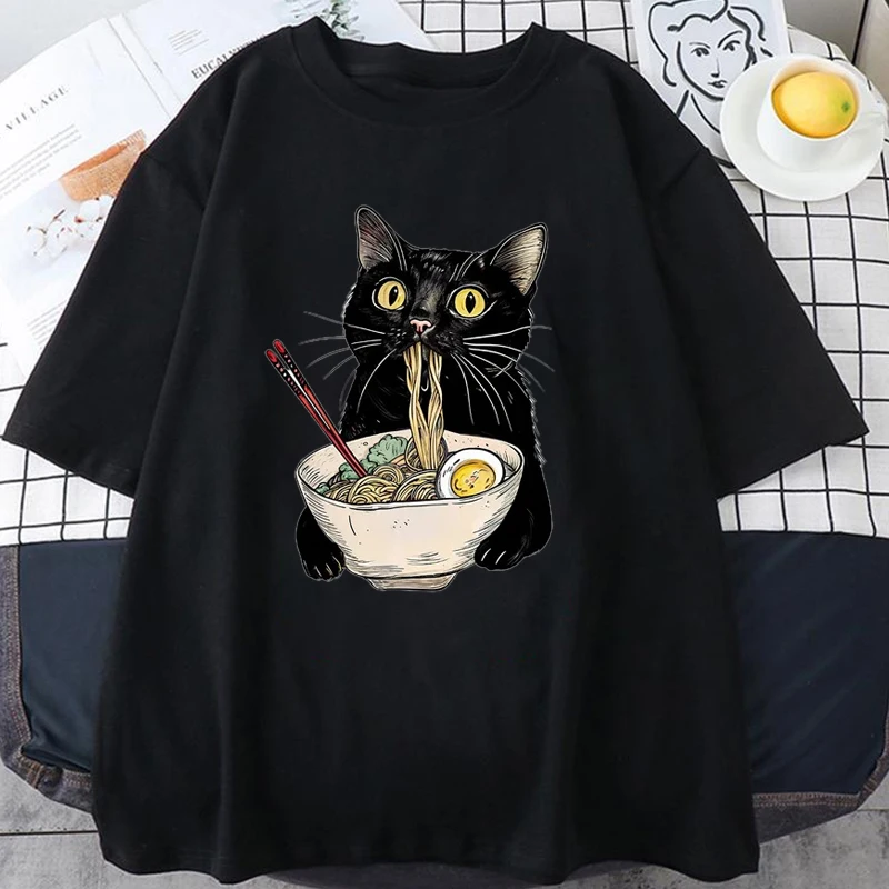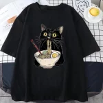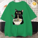 국수라면 고양이 티셔츠 Foodie Lover T 셔츠 검은 고양이 국수 티셔츠 레트로 캐주얼 반소매 Tshirt 남성 여성 의류