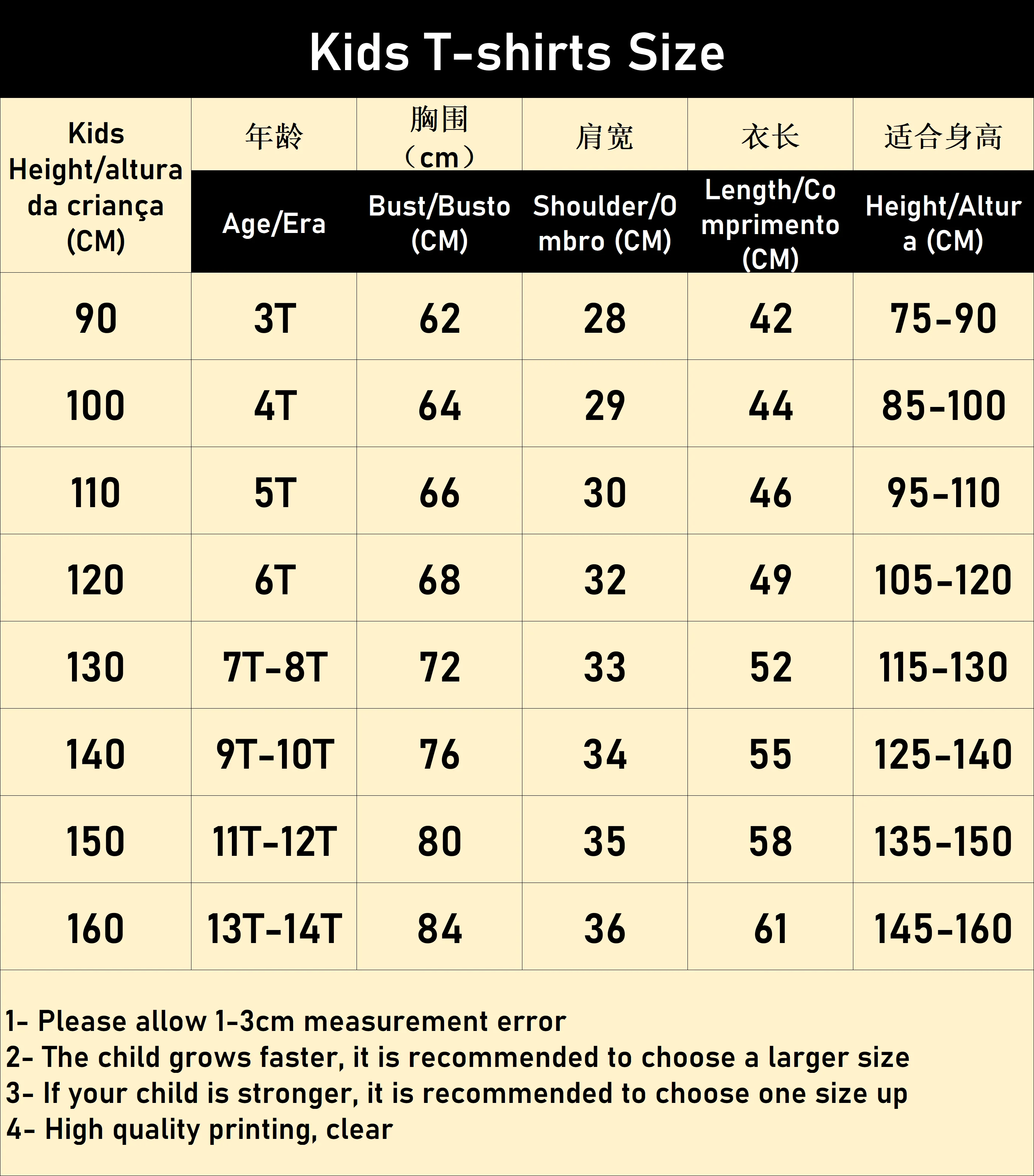 130 —- 6-8 세 — 흉상 80 cm, 폭 34 cm, 셔츠 길이 52 cm, 높이 115-130 cm