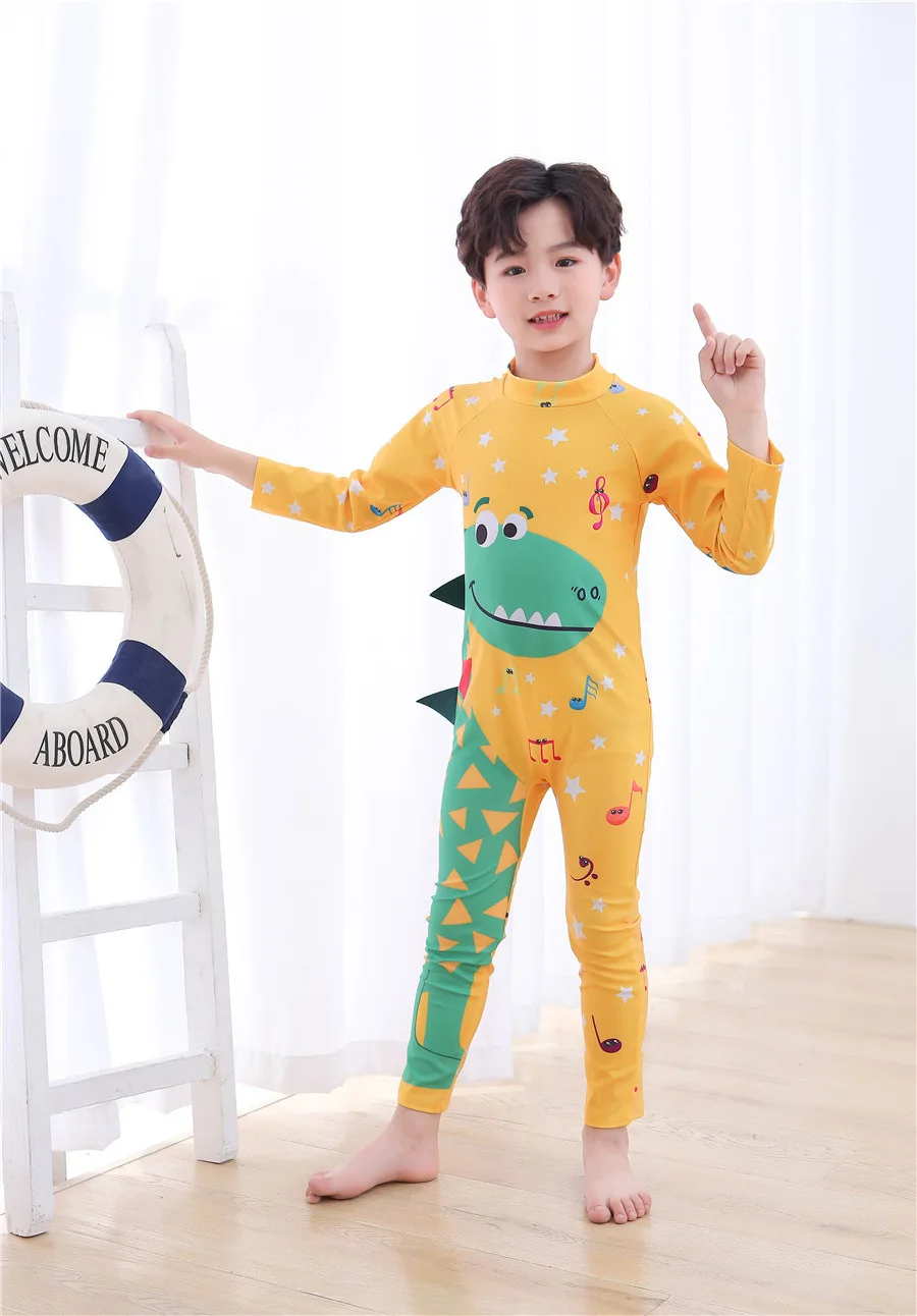 아이들을위한 귀여운 긴 소매 수영복 소년 수영복 비치 선 스크린 만화 수영복 수영 모자 어린이 서핑 슈트
