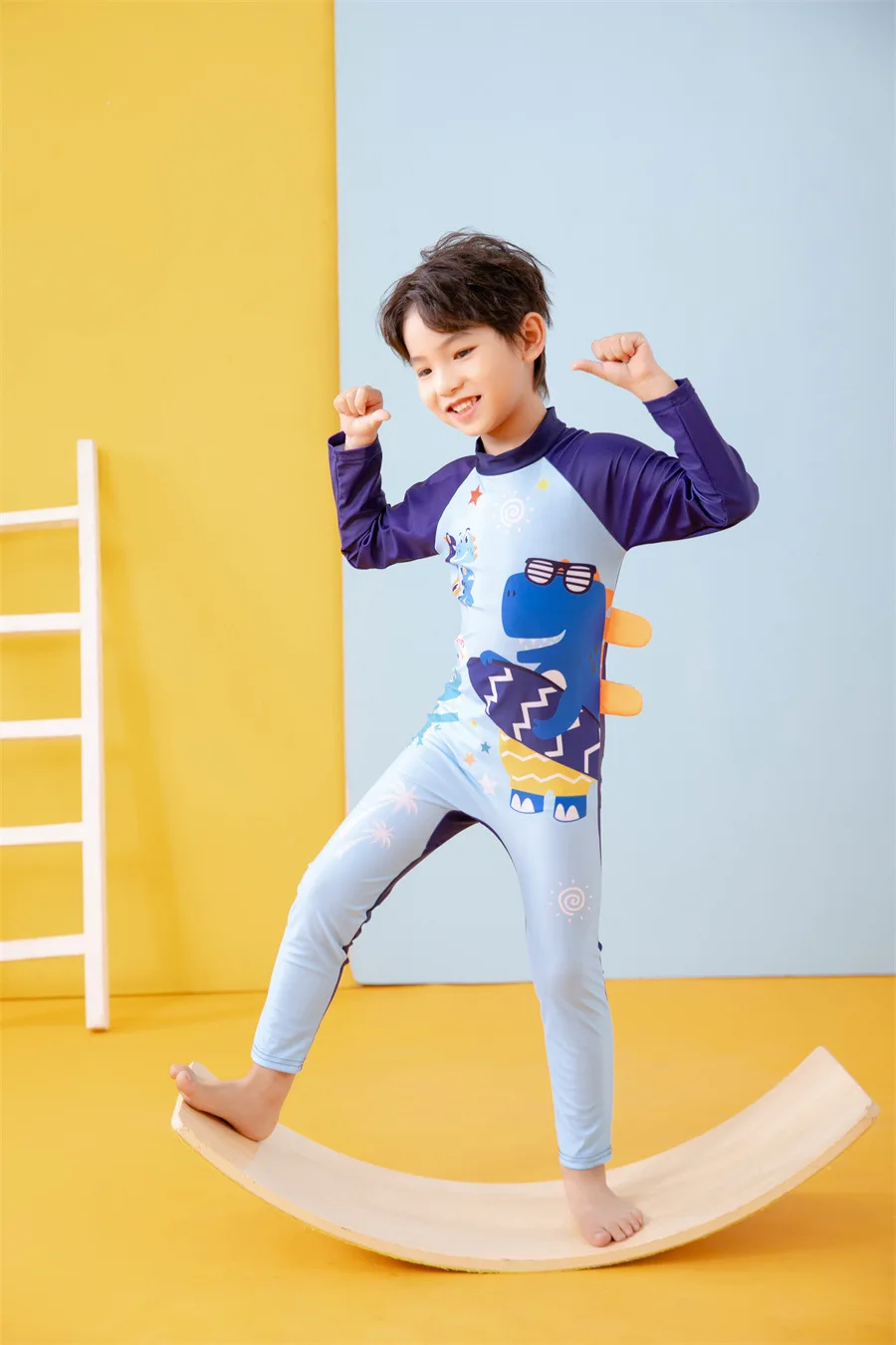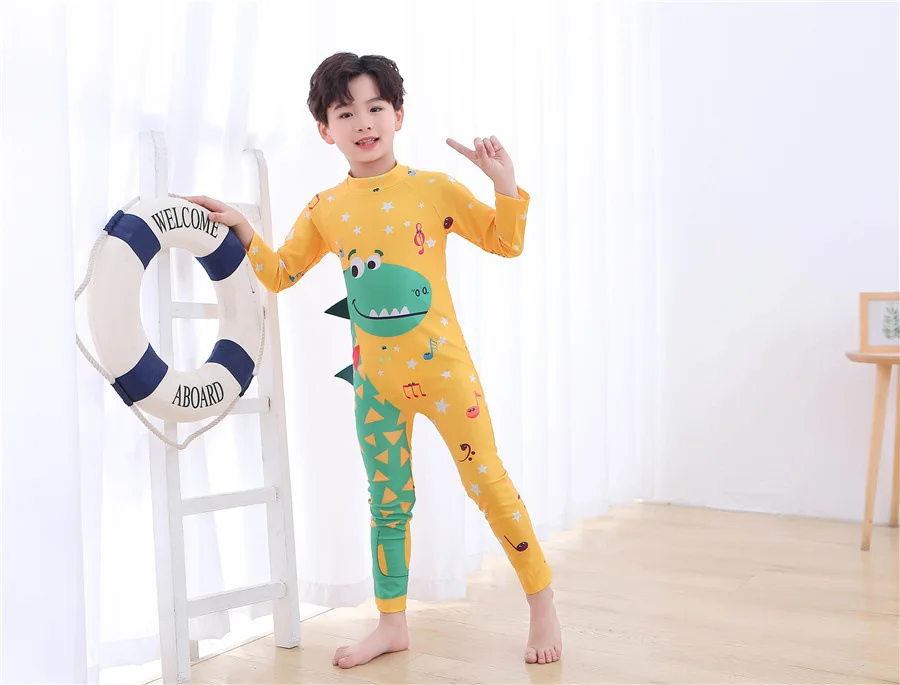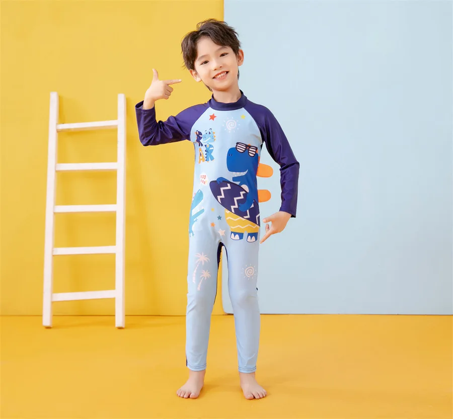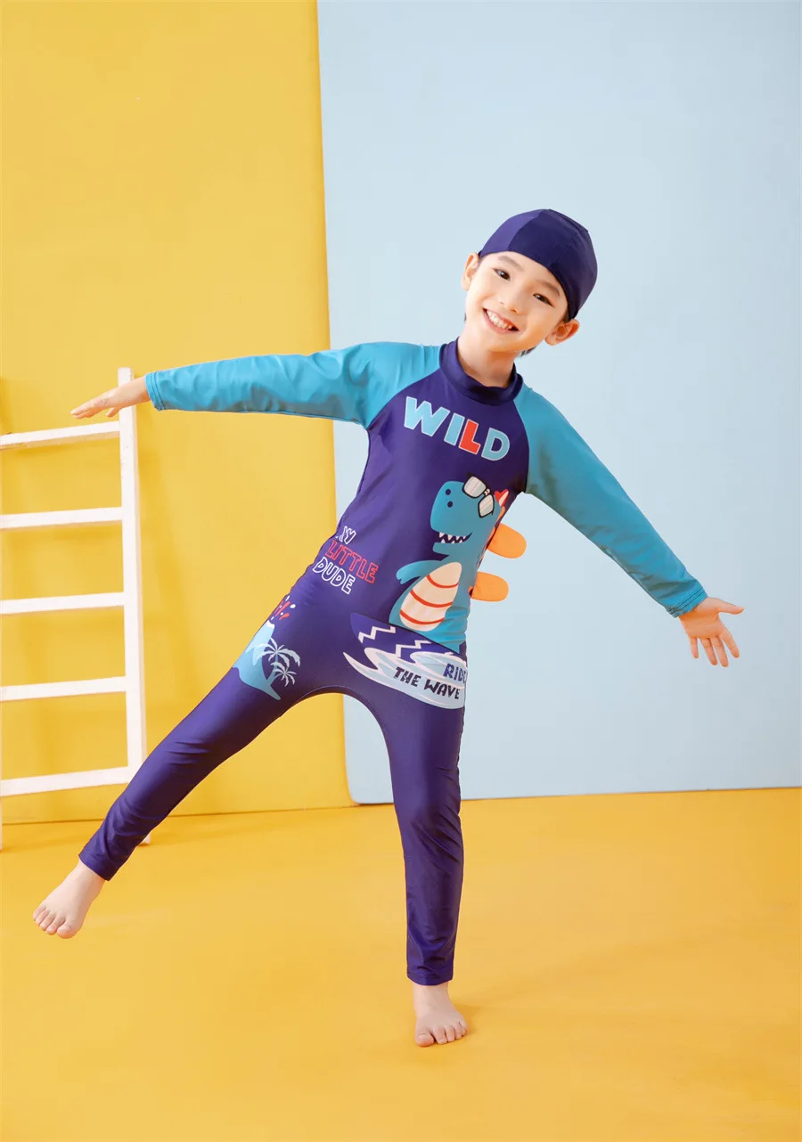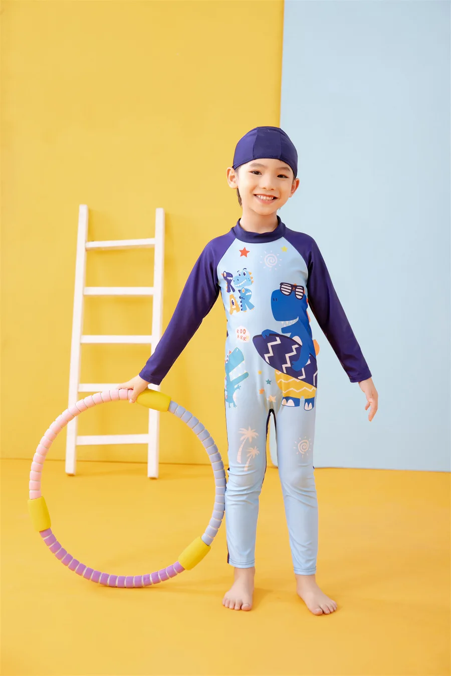 아이들을위한 귀여운 긴 소매 수영복 소년 수영복 비치 선 스크린 만화 수영복 수영 모자 어린이 서핑 슈트