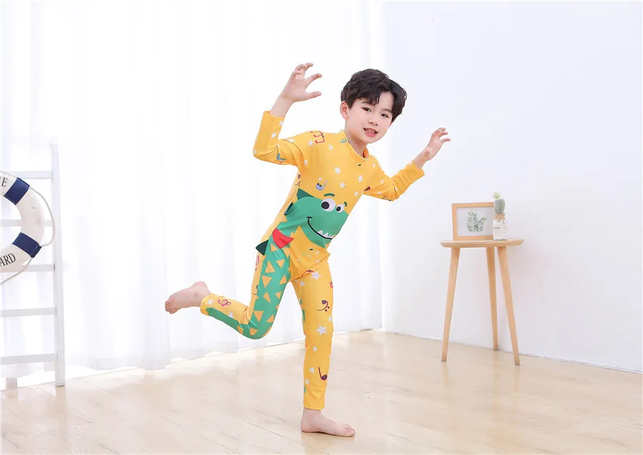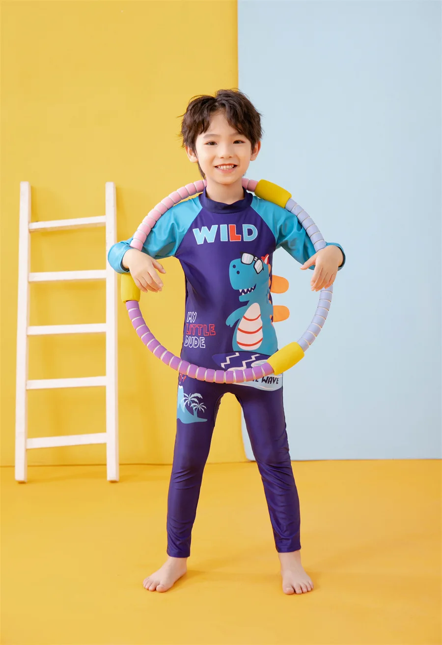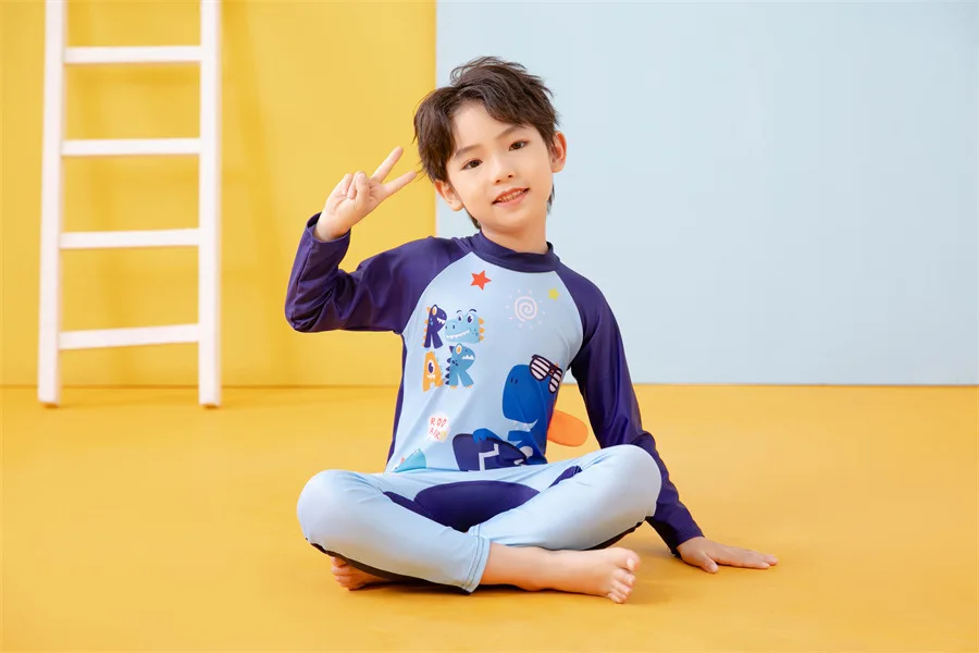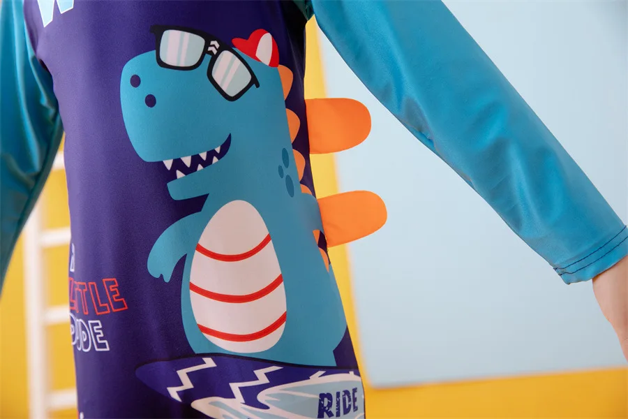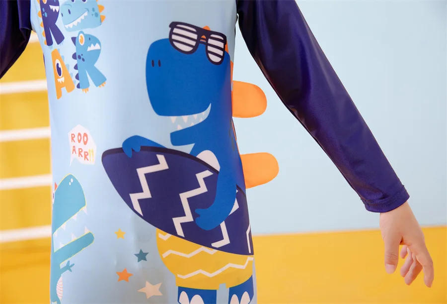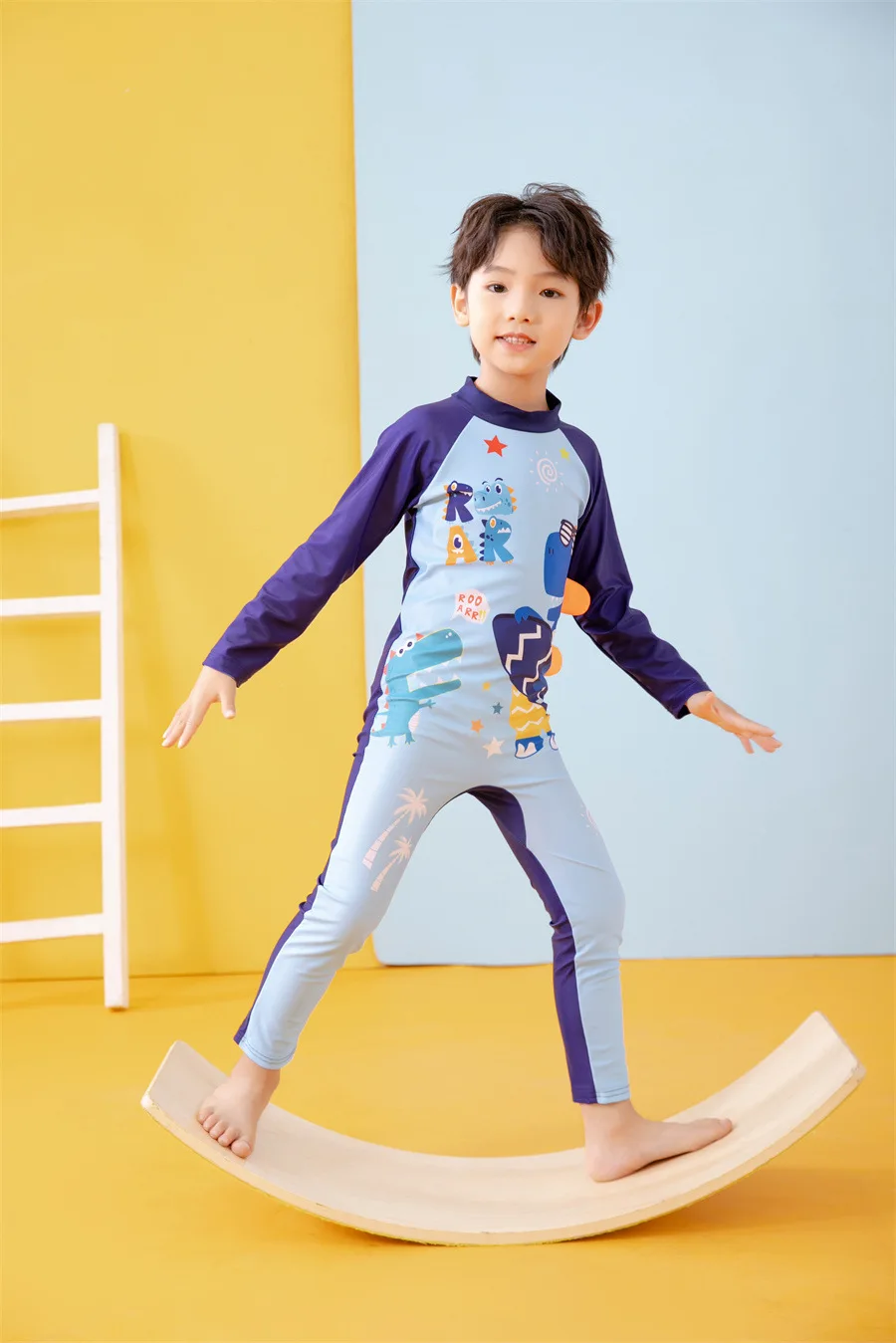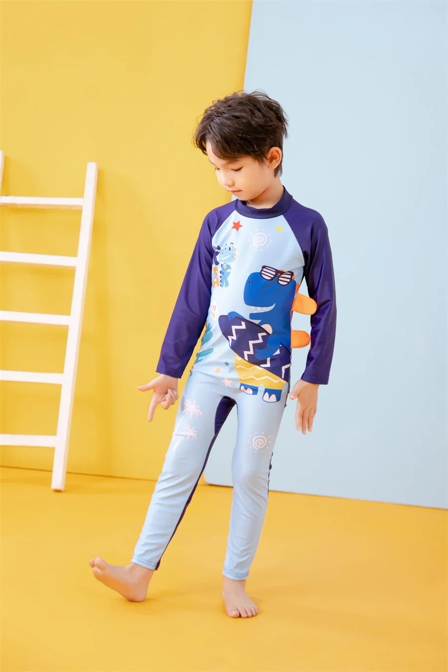 아이들을위한 귀여운 긴 소매 수영복 소년 수영복 비치 선 스크린 만화 수영복 수영 모자 어린이 서핑 슈트
