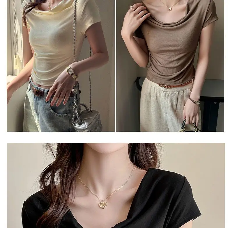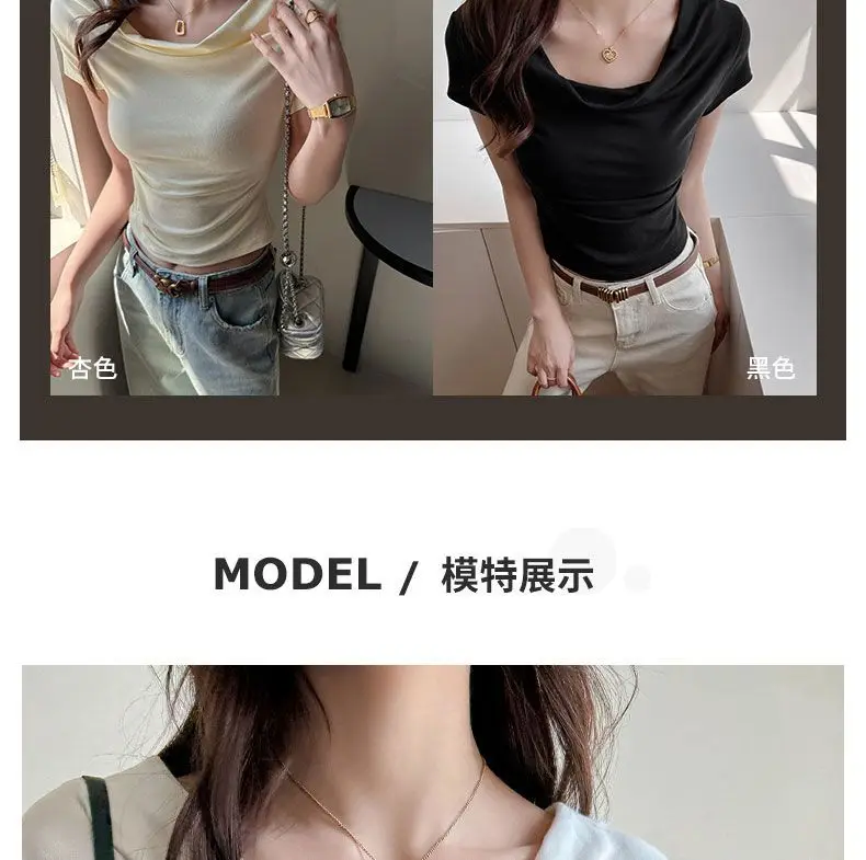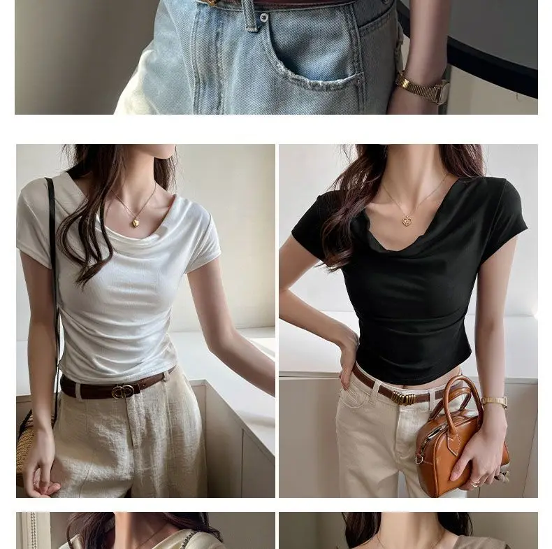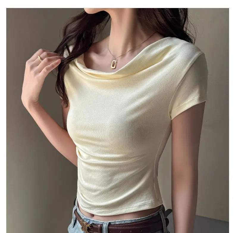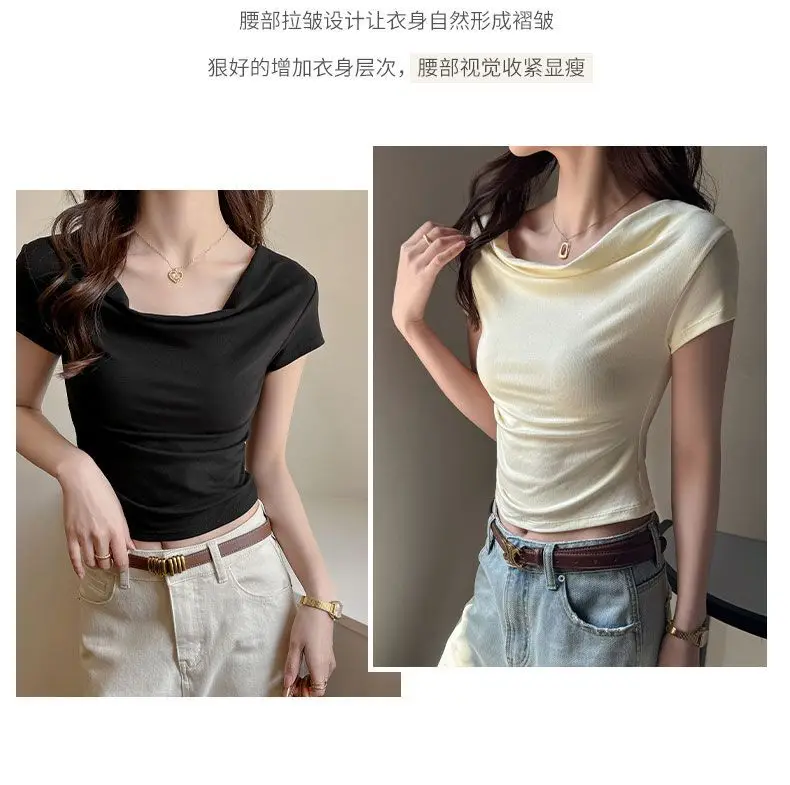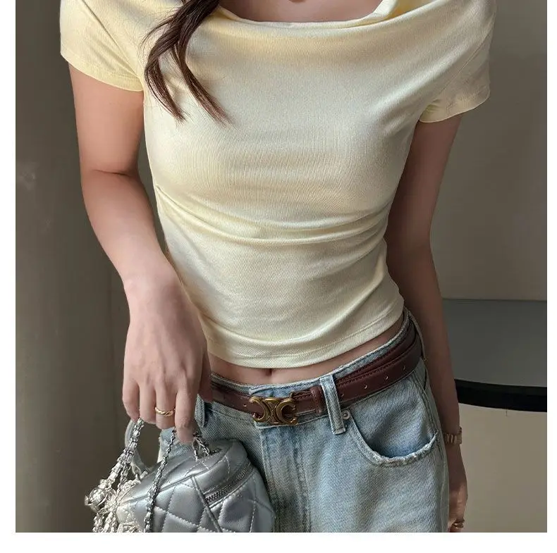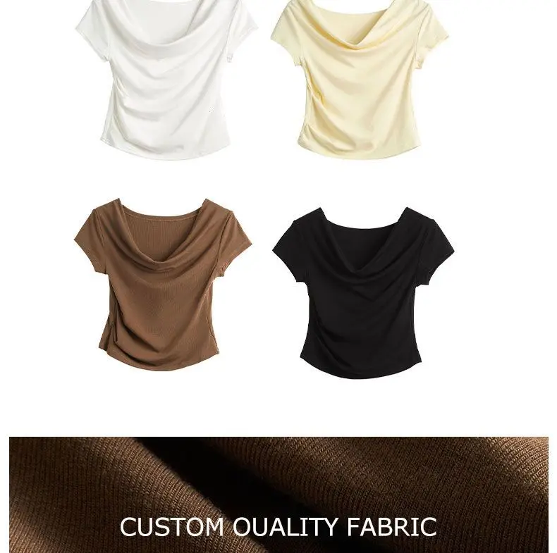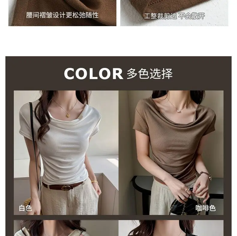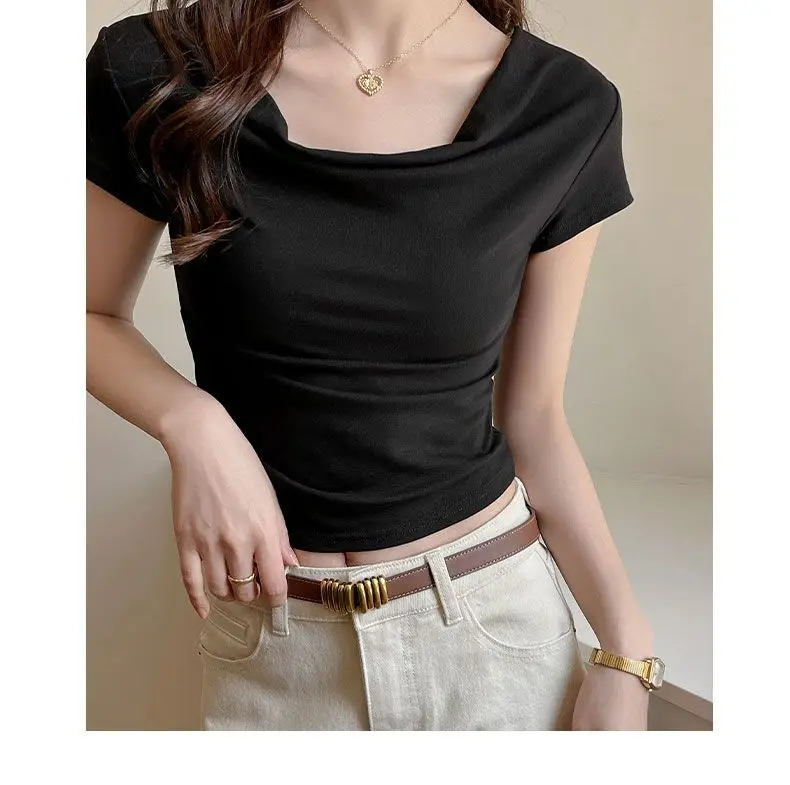 여름 짧은 소매 티셔츠 여성 사이드 플리츠 슬림 피트 오프 숄더 넥 크롭 탑