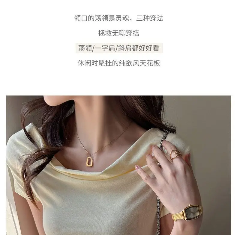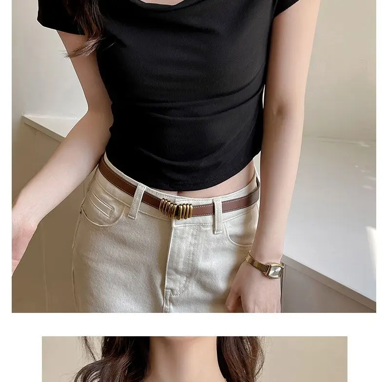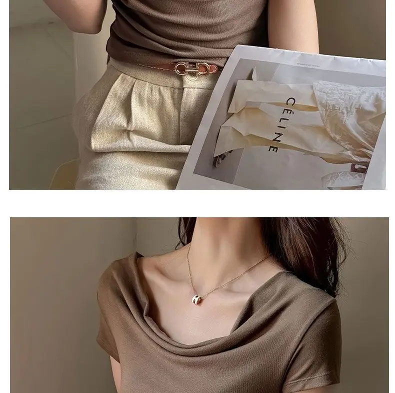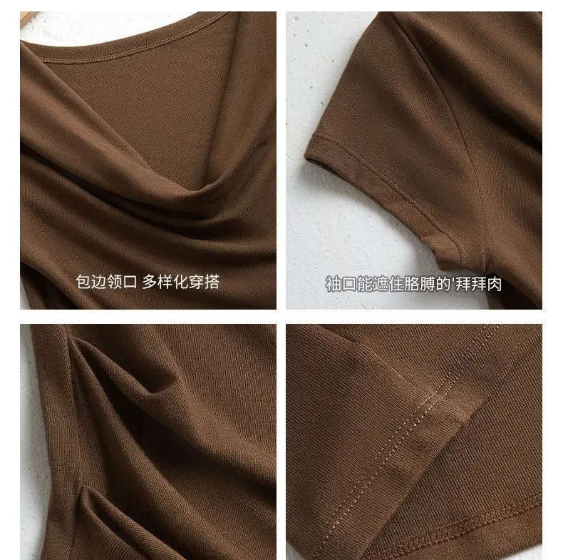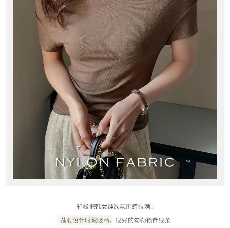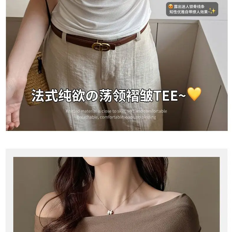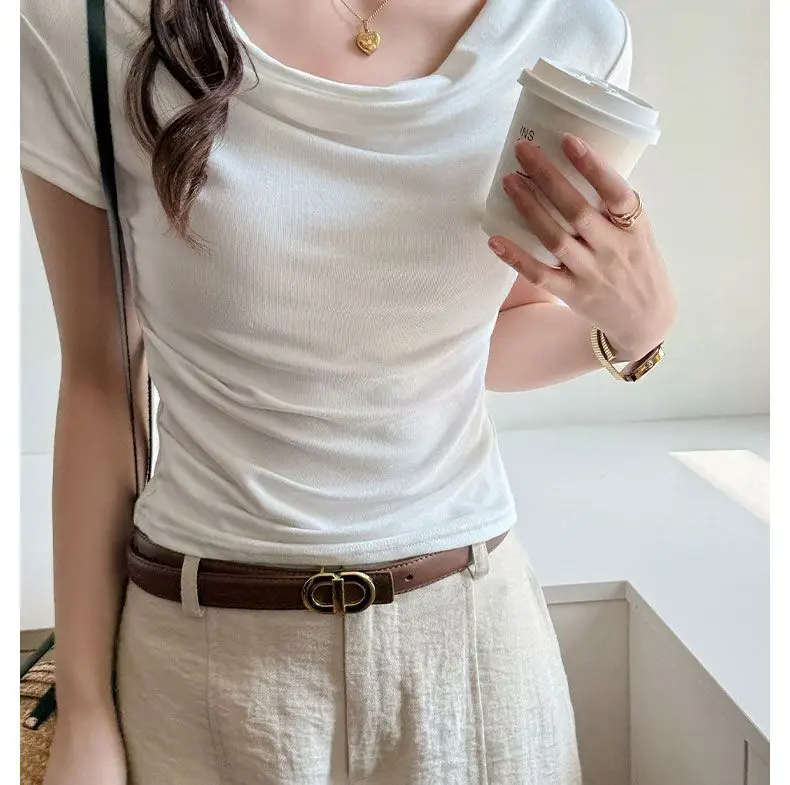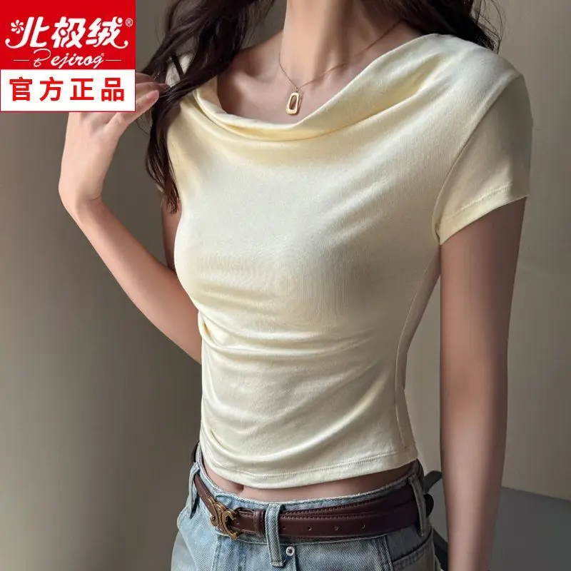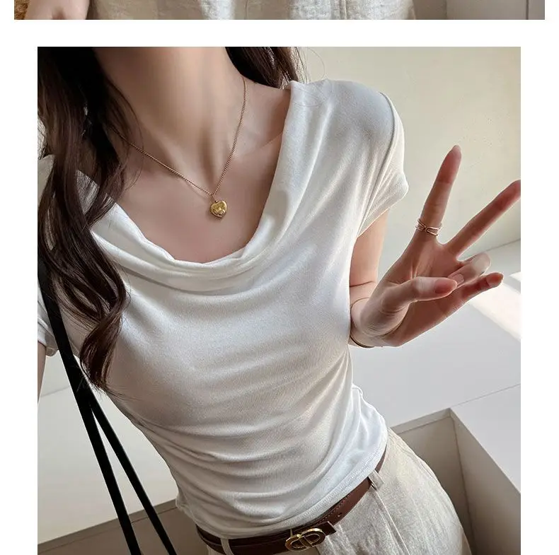 여름 짧은 소매 티셔츠 여성 사이드 플리츠 슬림 피트 오프 숄더 넥 크롭 탑