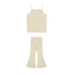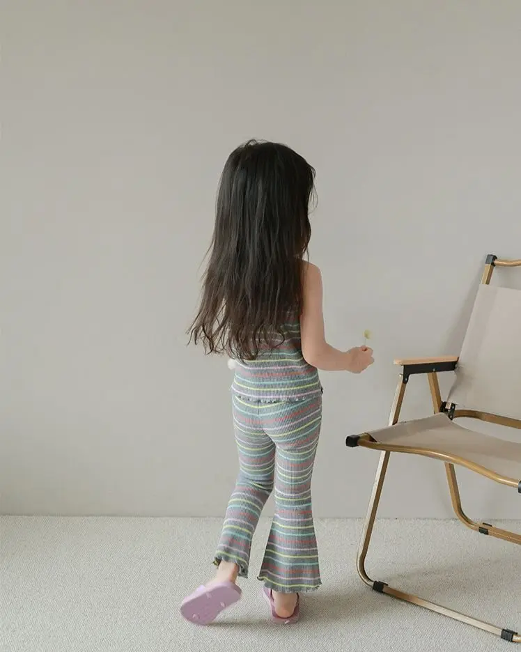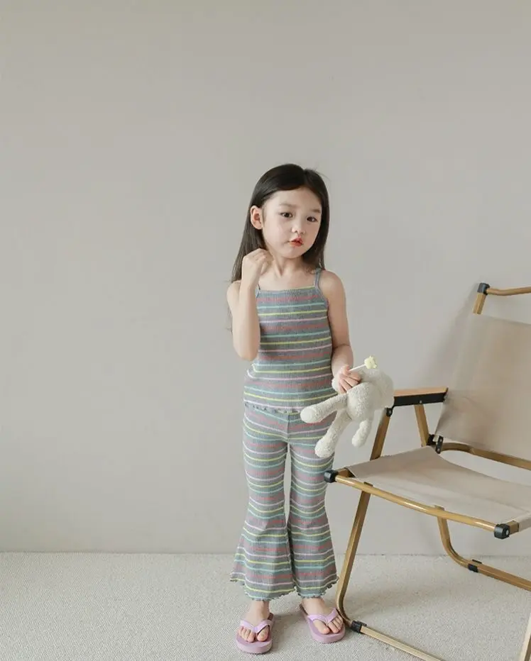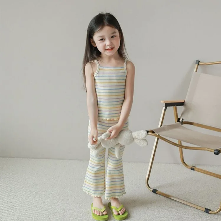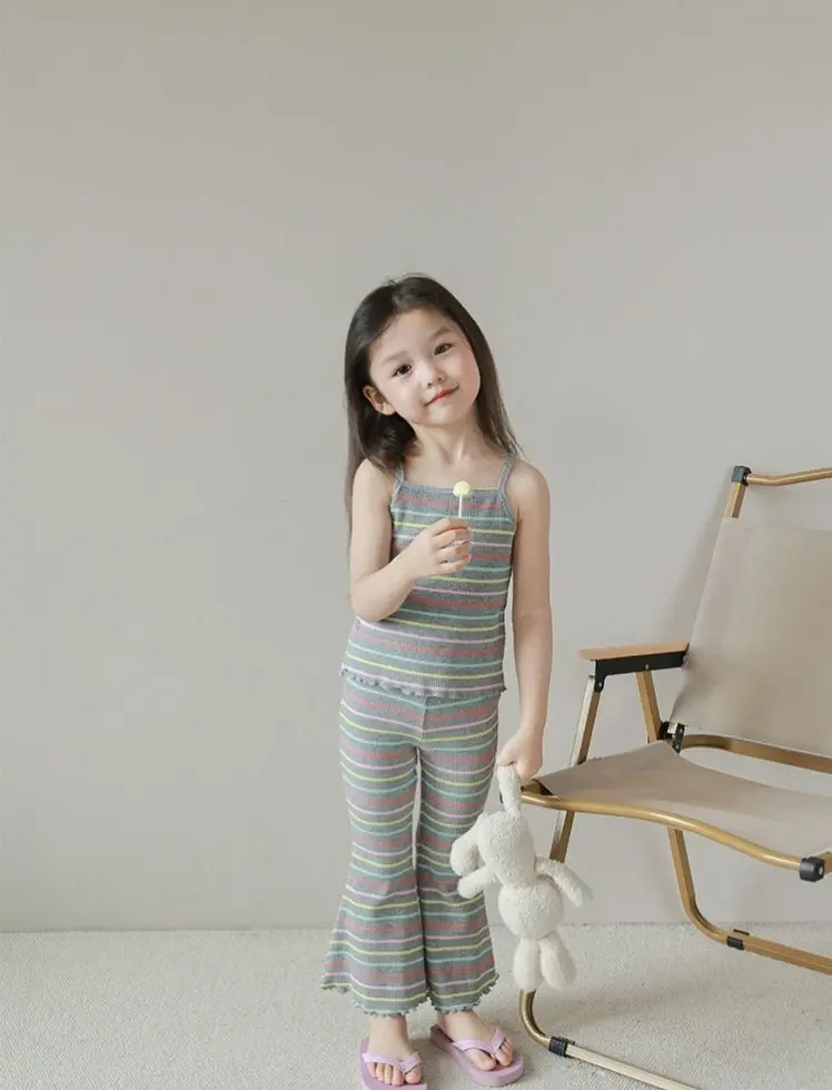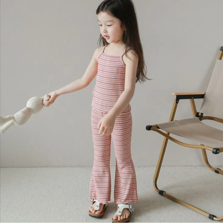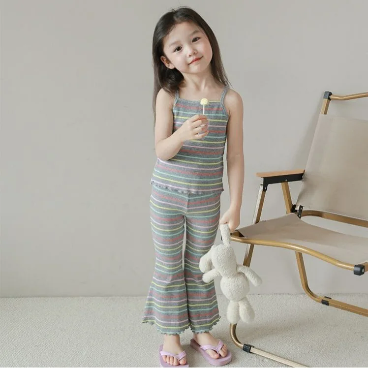 여름 한국 스타일 유행 서양식 세트 얼음 실크 얇은 스타일 어린이 줄무늬 스트랩 탱크 탑 Bellbottom 바지 세트