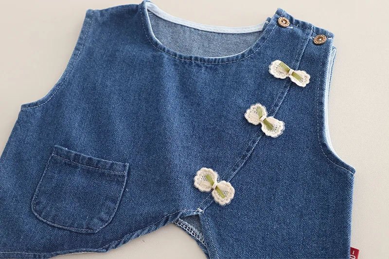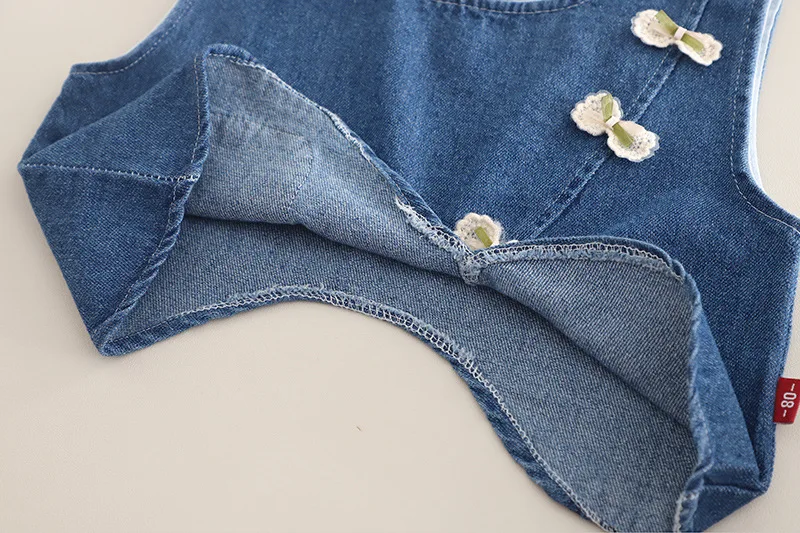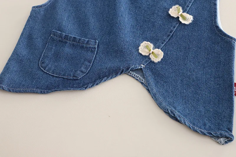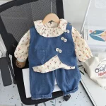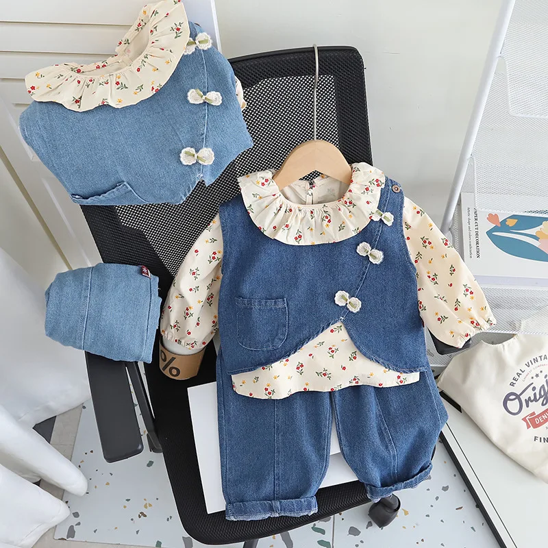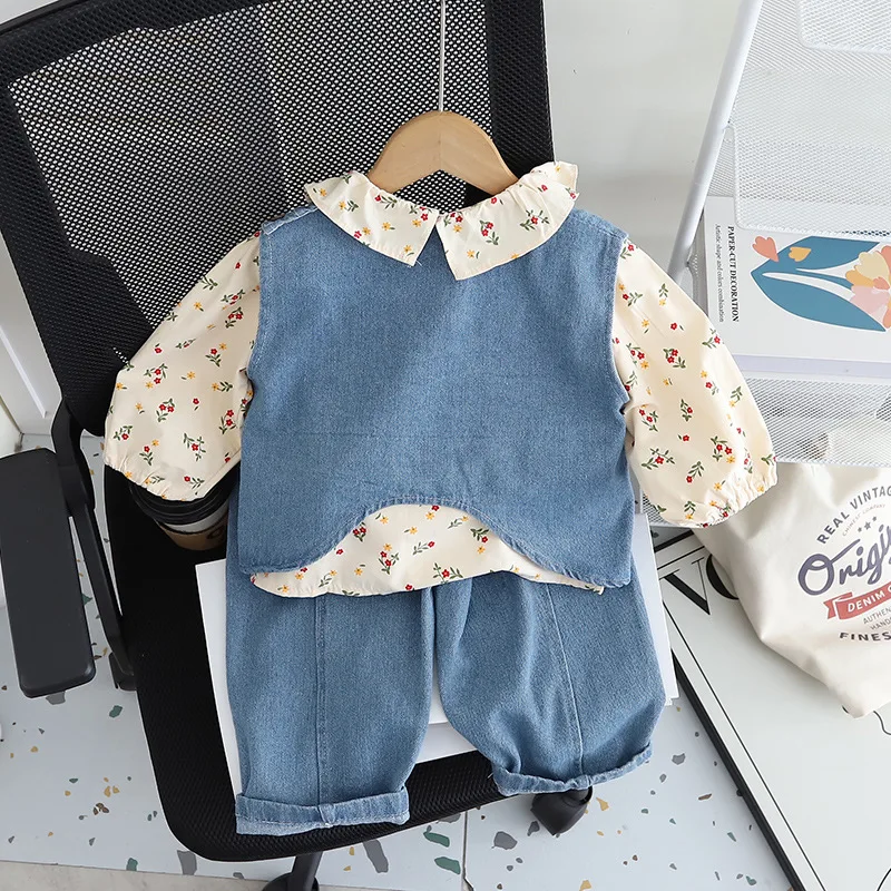 여아용 면 소재 정장 3종 세트 (1-5세) 데님 조끼, 꽃무늬 탑, 와이드 레그 청바지, 귀엽고 캐주얼한 여아 의류