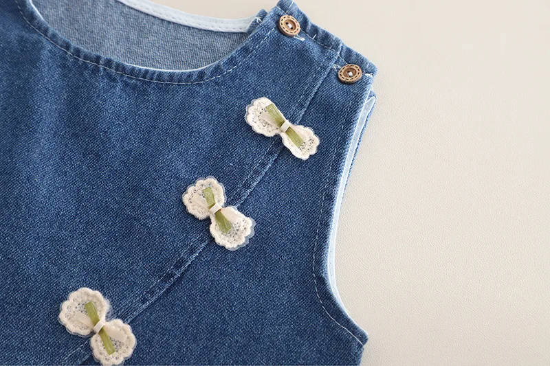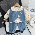 2.**매력적인 3피스 디자인**: 리본이 달린 데님 조끼, 꽃무늬 탑, 와이드 레그 진이 포함되어 귀엽고 조화로운 룩을 선사합니다.