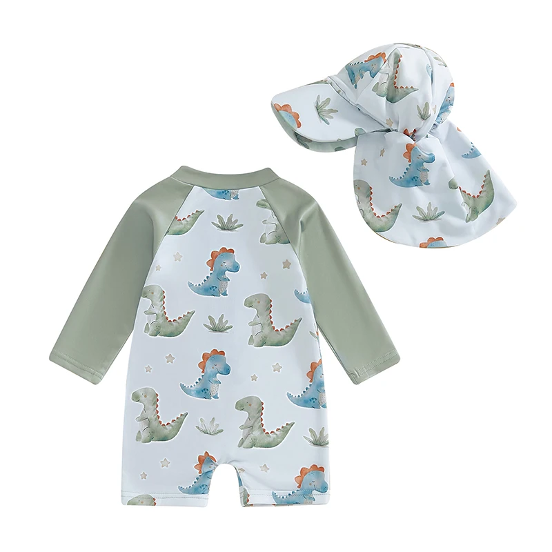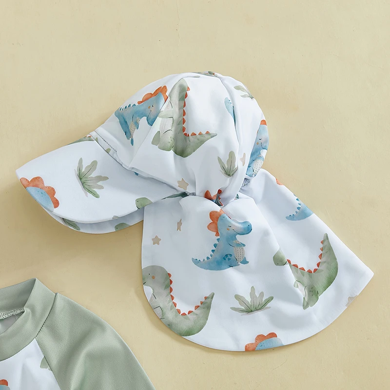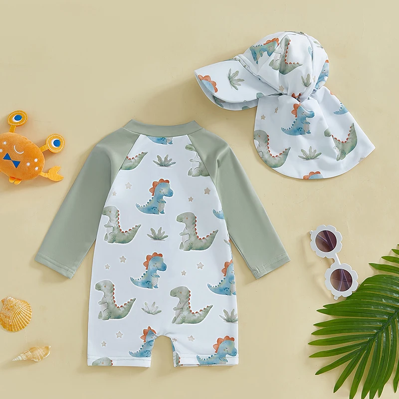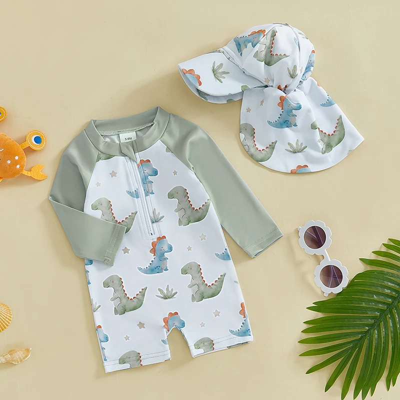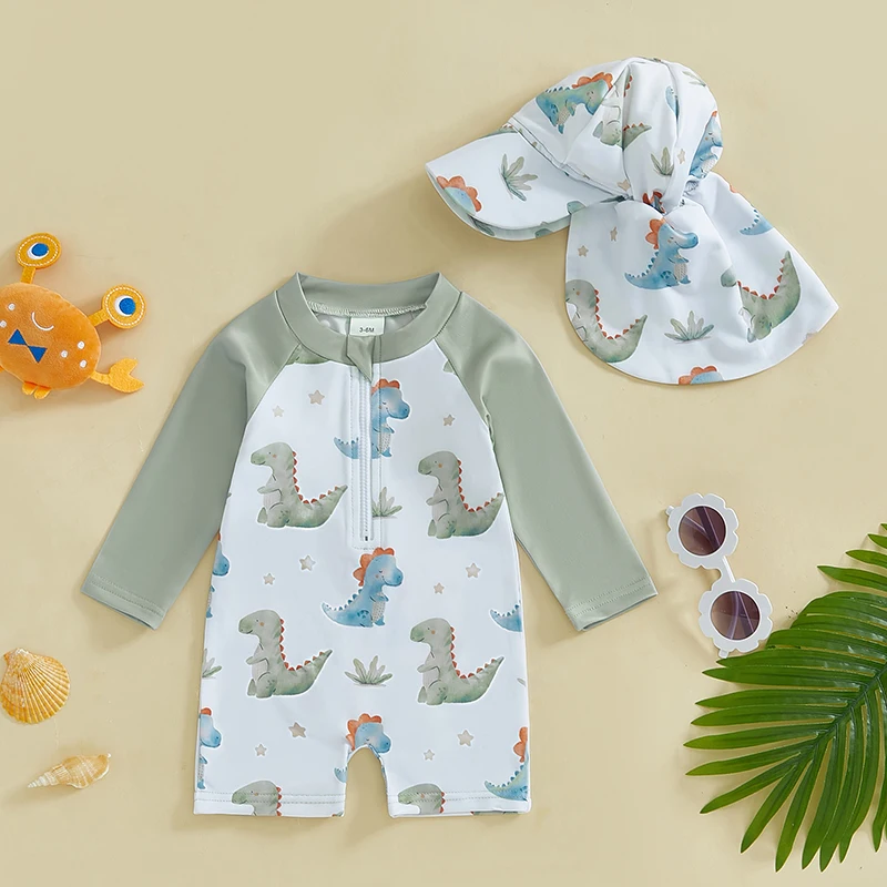 유아 소년 래쉬 가드 수영복 디너/게 인쇄 긴 소매 지퍼 수영 모자와 목욕 세트