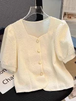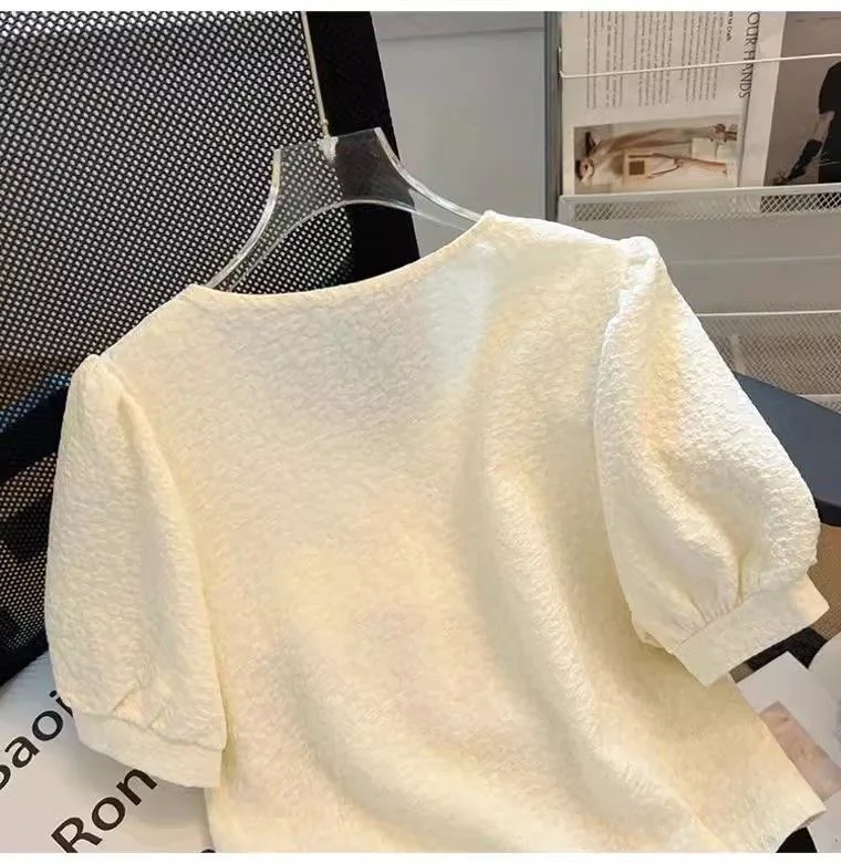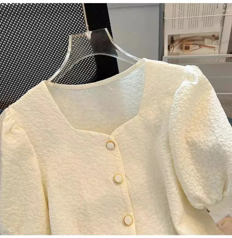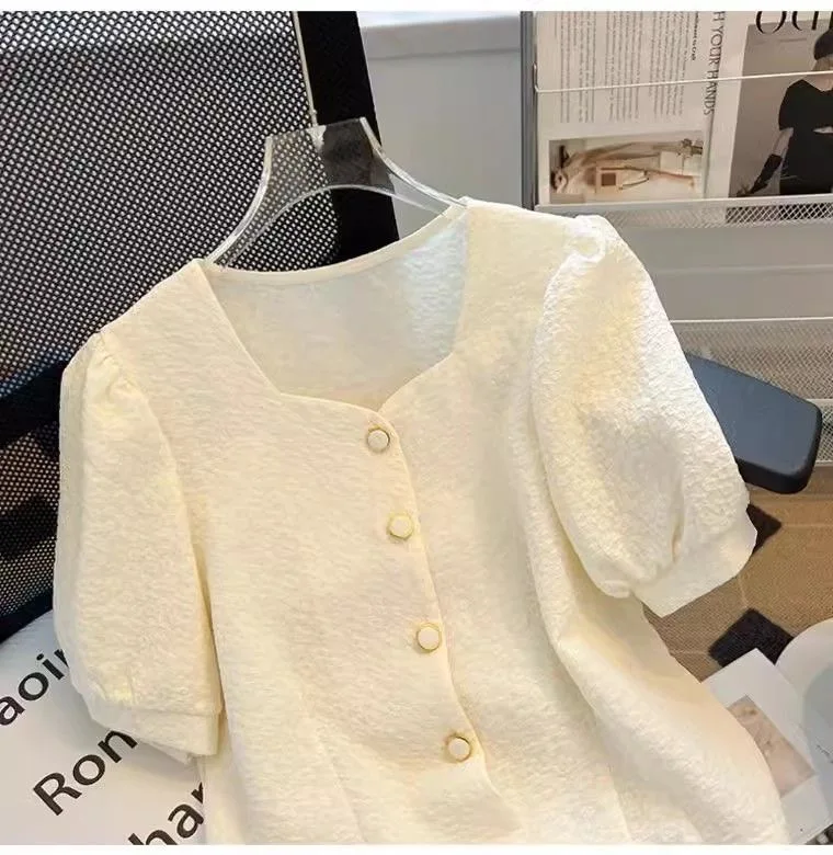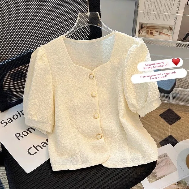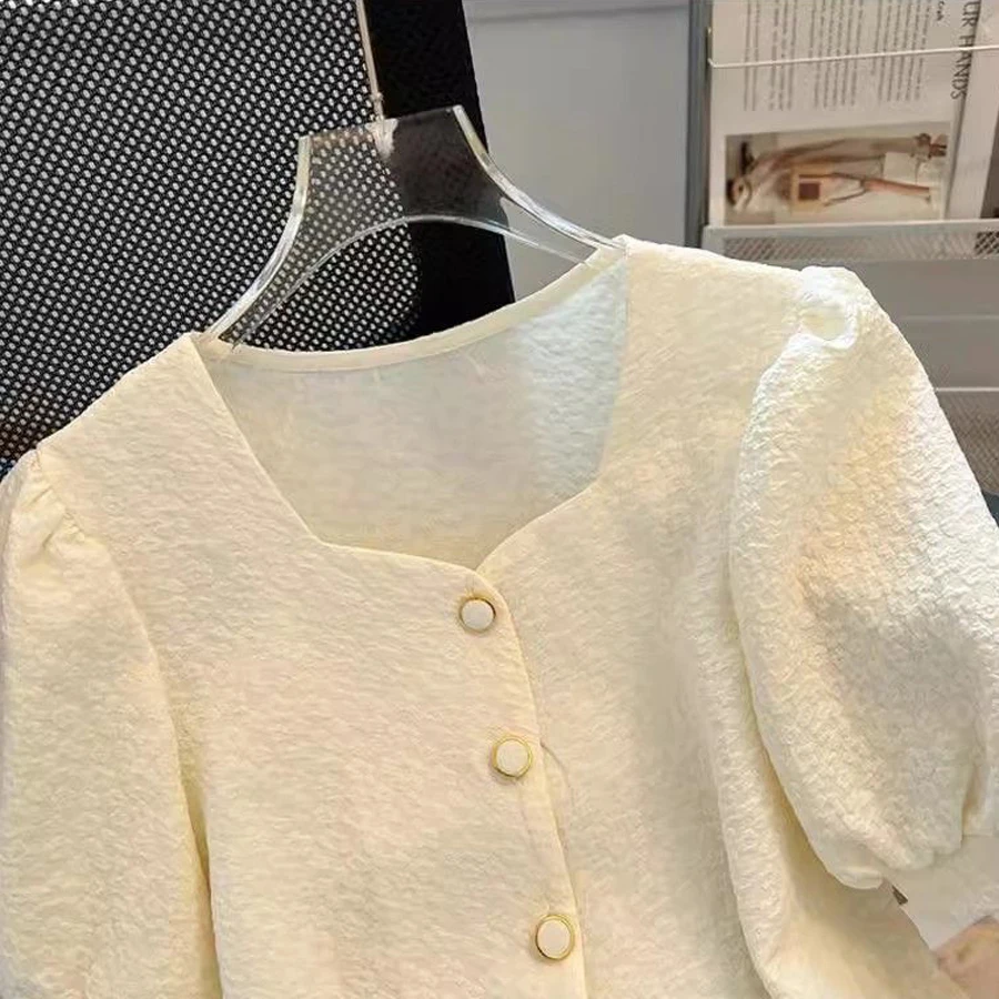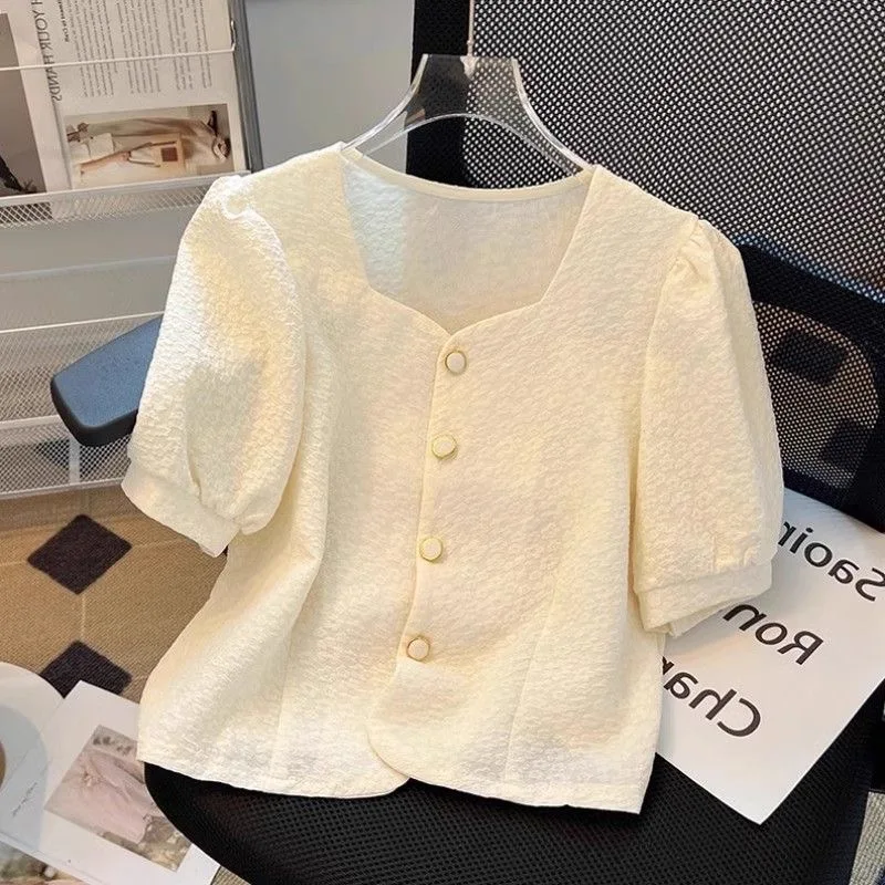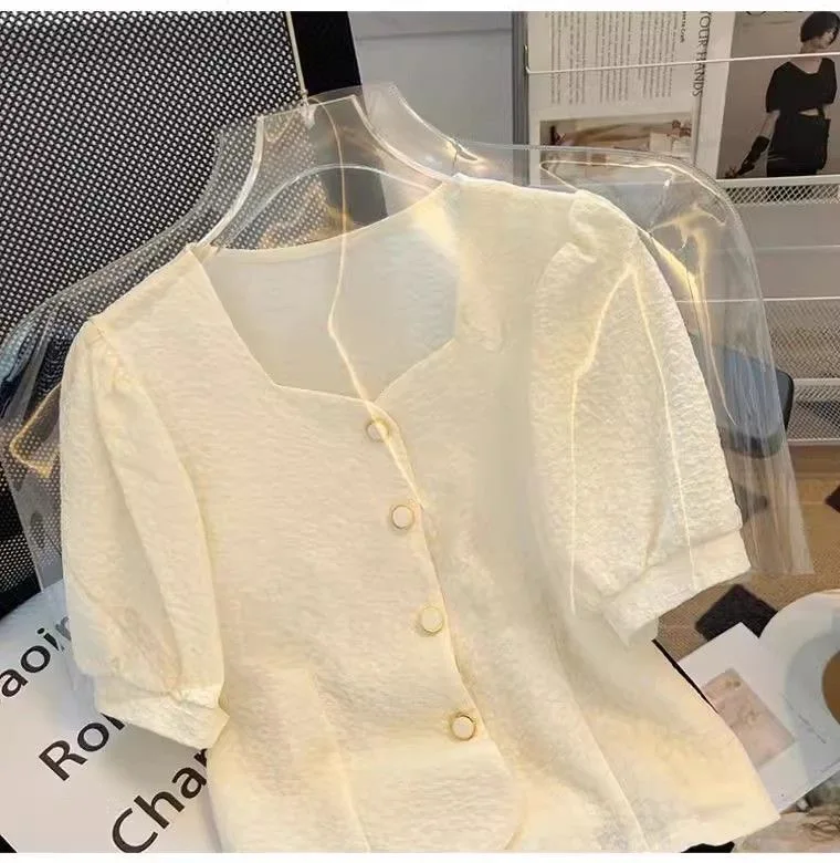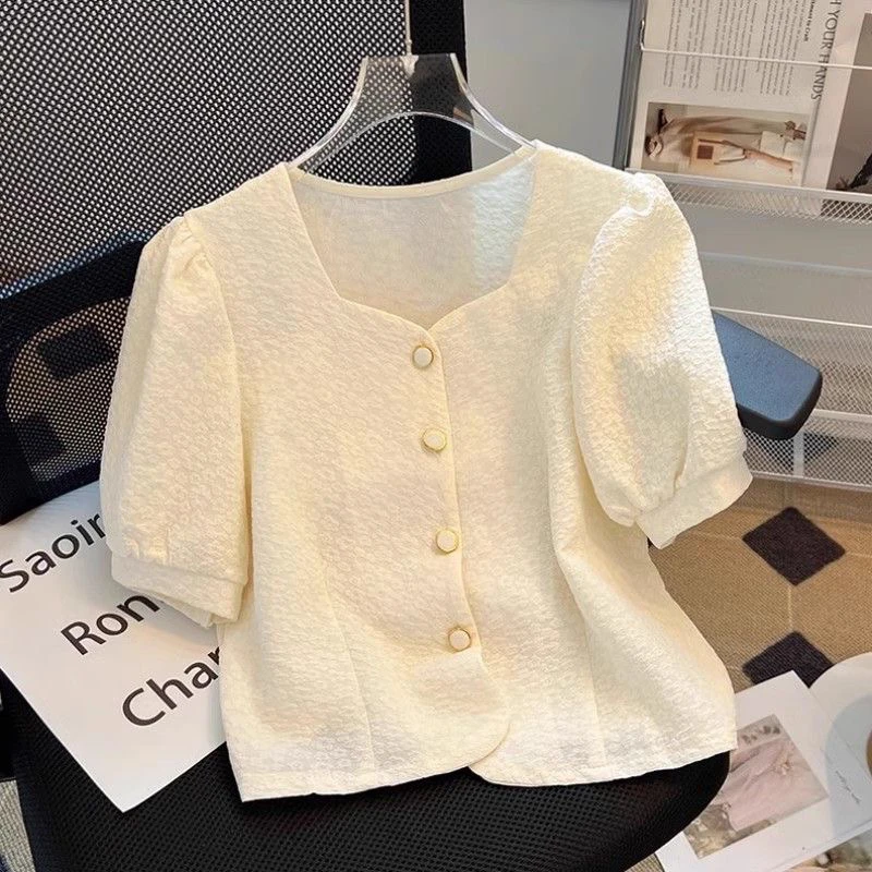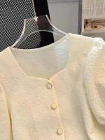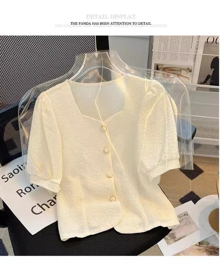 프렌치 스타일 루즈핏 반소매 스퀘어 칼라 오픈 가디건 여성 티셔츠 짧은 길이 탑 버블 슬리브 얇은 소재