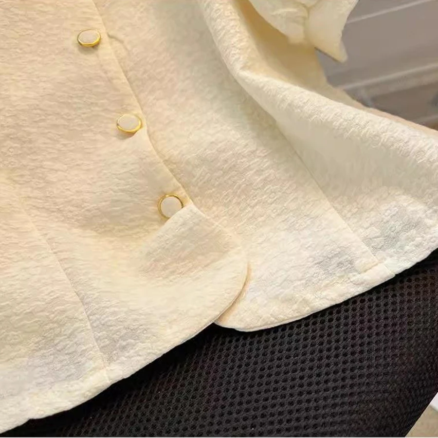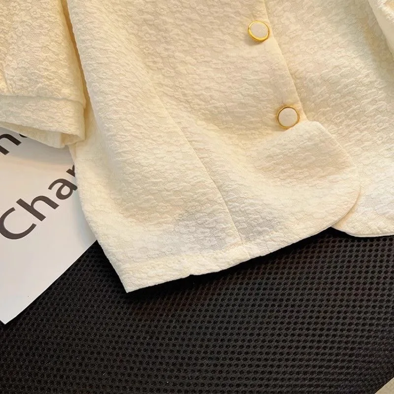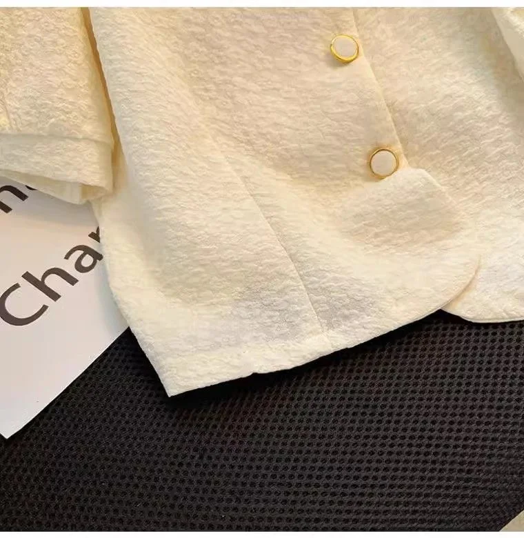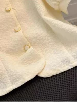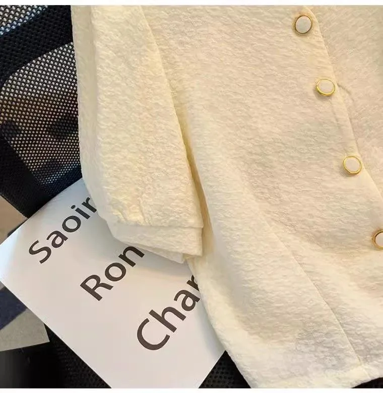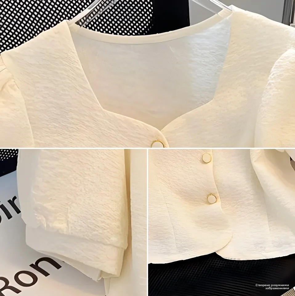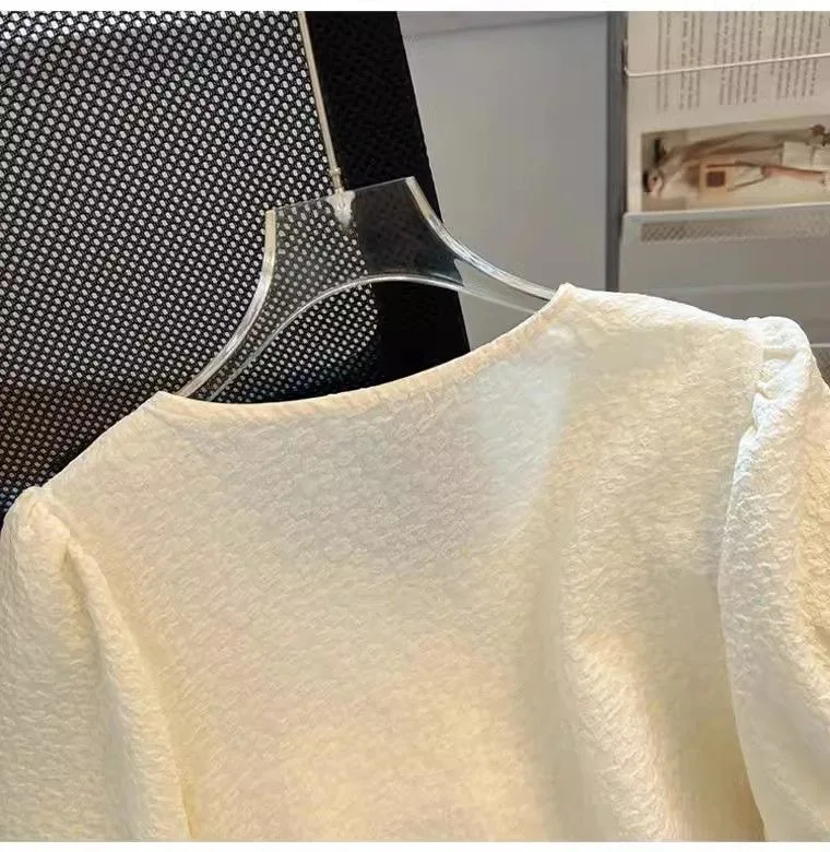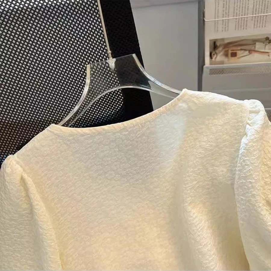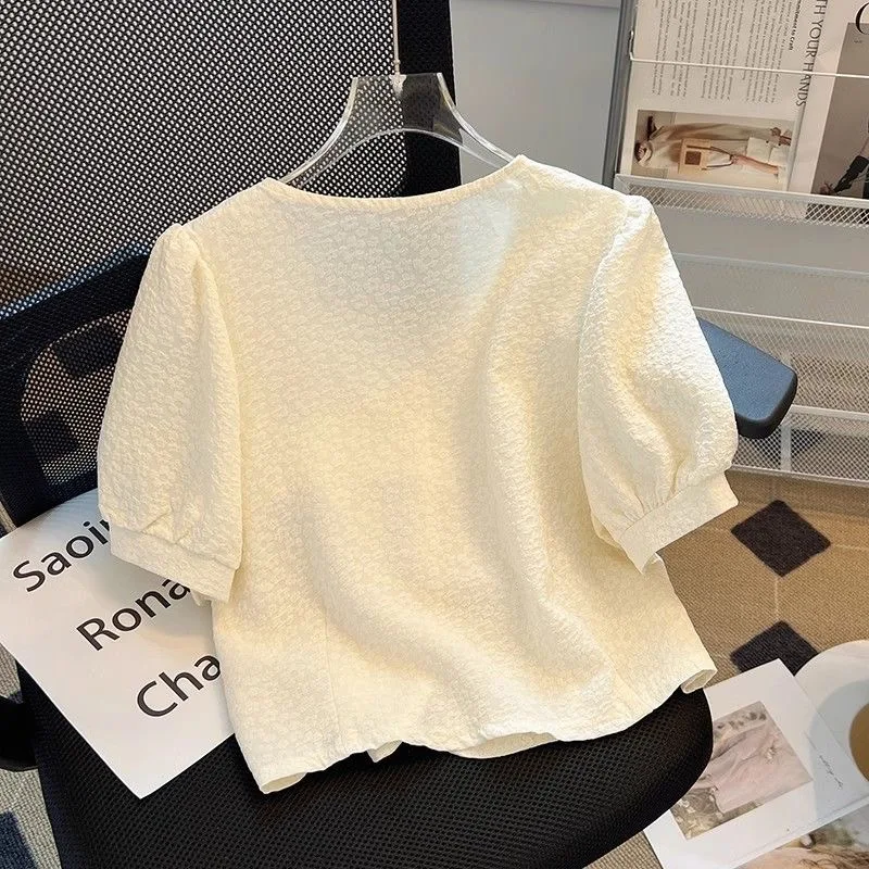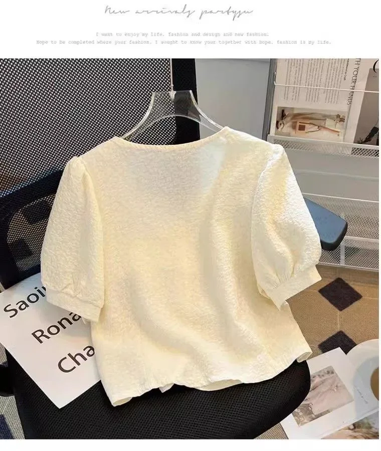 프렌치 스타일 루즈핏 반소매 스퀘어 칼라 오픈 가디건 여성 티셔츠 짧은 길이 탑 버블 슬리브 얇은 소재