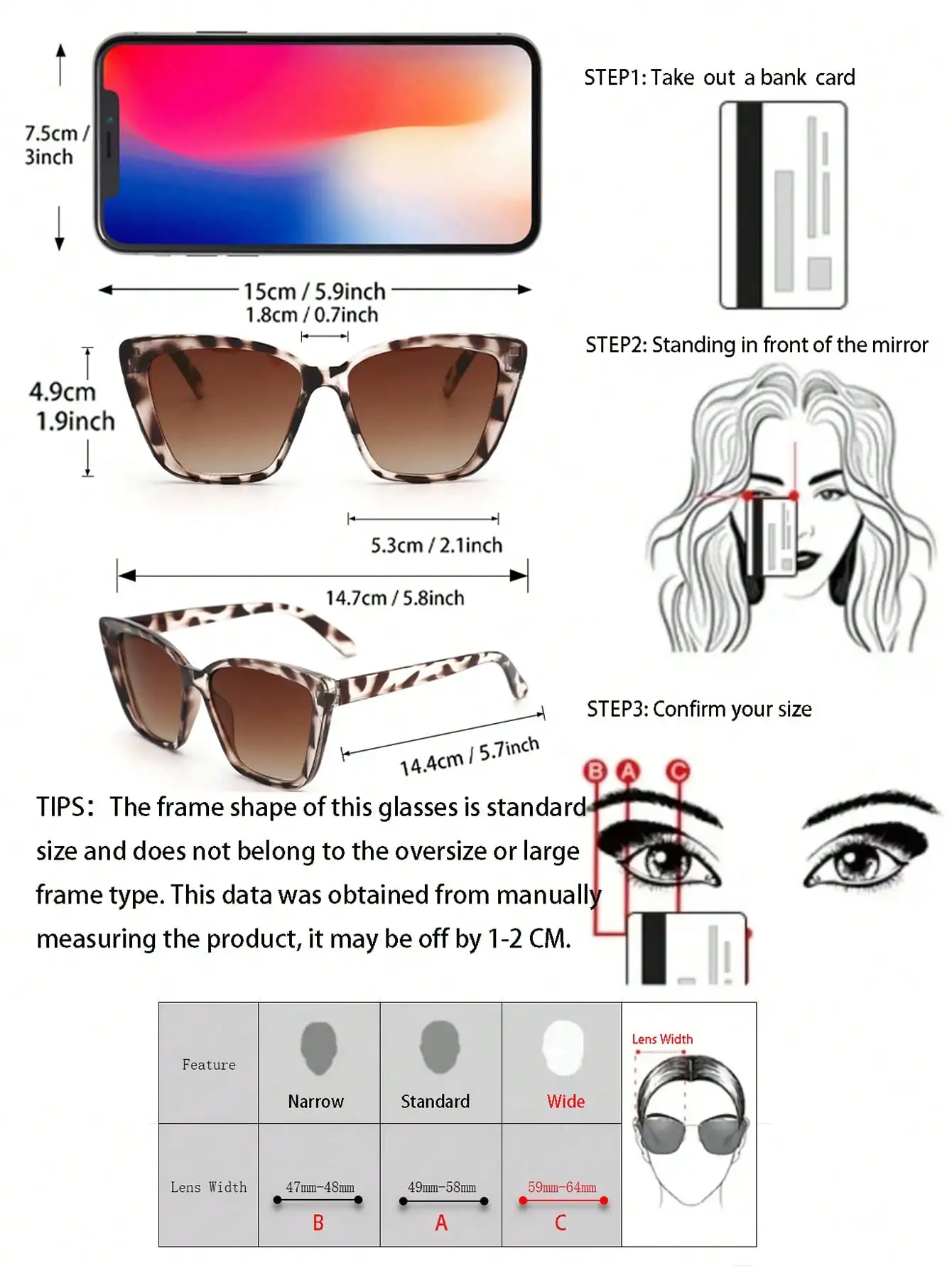 거울 너비 * 거울 높이 * 렌즈 거리 * 템플 길이 * 총 거울 너비(CM):5.3*4.9*1.8*14.4*14.7