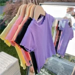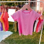 1-8Y 어린이 반팔 티셔츠 새로운 한국 여자 아기 여름 옷 다목적 니트 스트라이프 프릴 가장자리 아동상의에 대한 2개 리뷰
