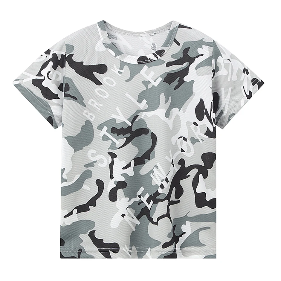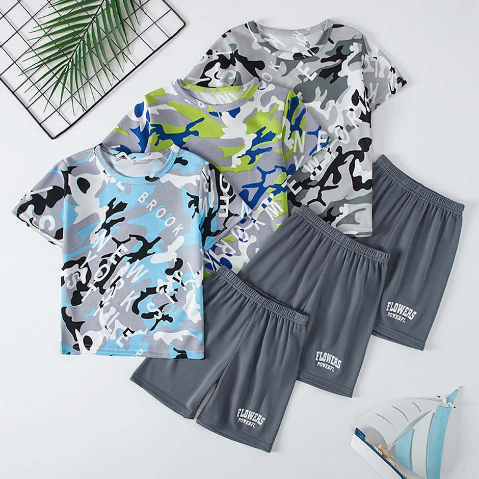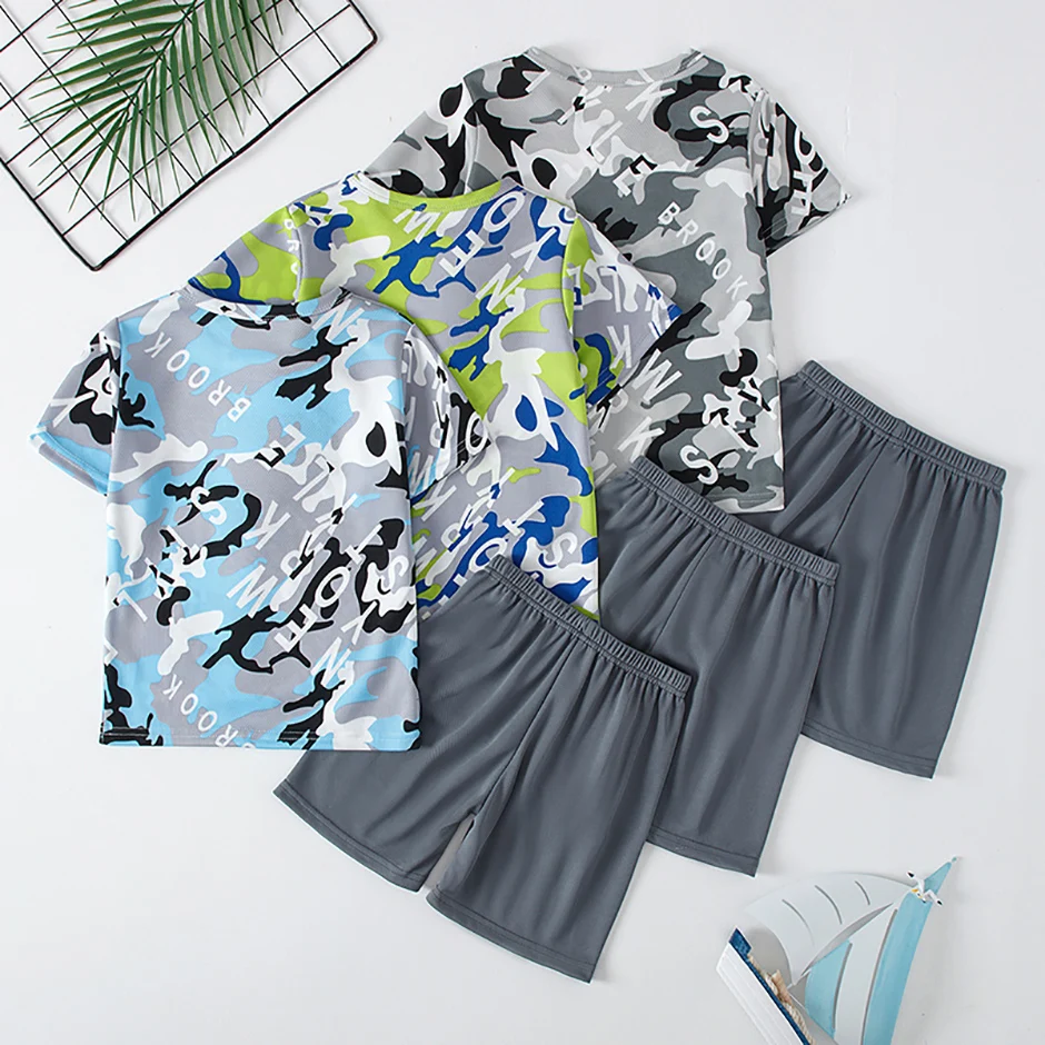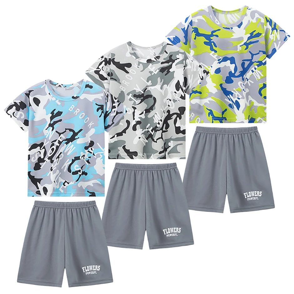 2/6 팩 여름 어린이를위한 여러 가지 빛깔의 위장 빠른 건조 양복 소년 스포츠 러닝 반팔 반바지 소녀 레저 슈트
