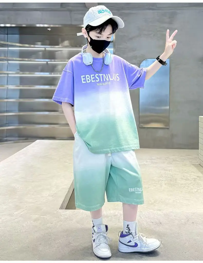 2025 여름 십대 소년 의류 세트 복장 어린이 편지 Tracksuit 어린이 t 셔츠 탑 + 느슨한 바지 반바지 바지 4 8 10 12 14 년