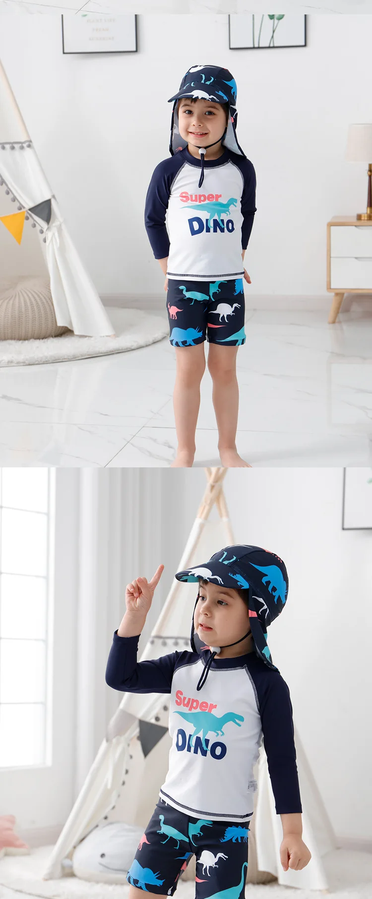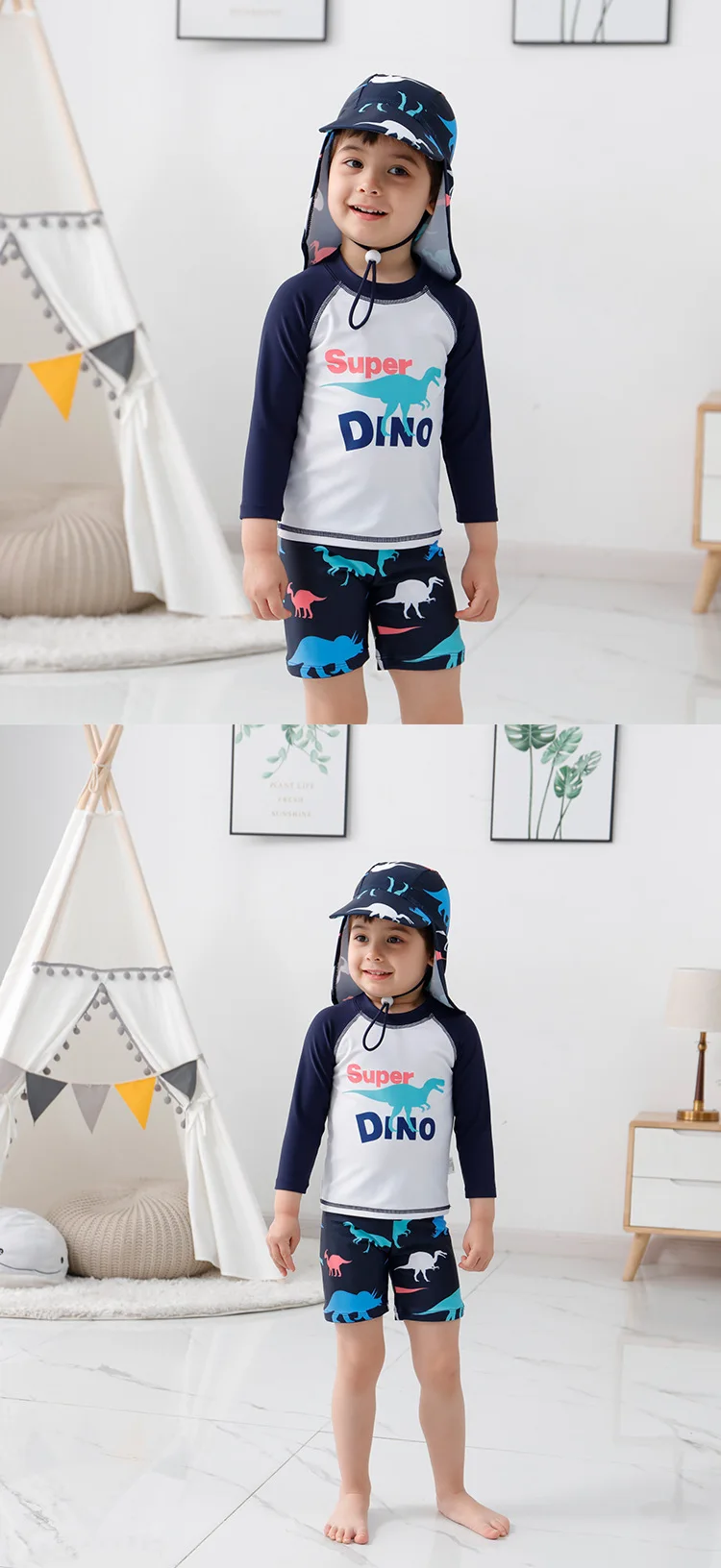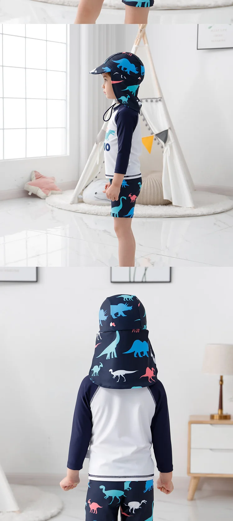 3 개 어린이 수영복 세트 소년 빠른 건조 긴 짧은 소매 상어 패턴 Drawstring 수영 트렁크 모자 분할 수영복